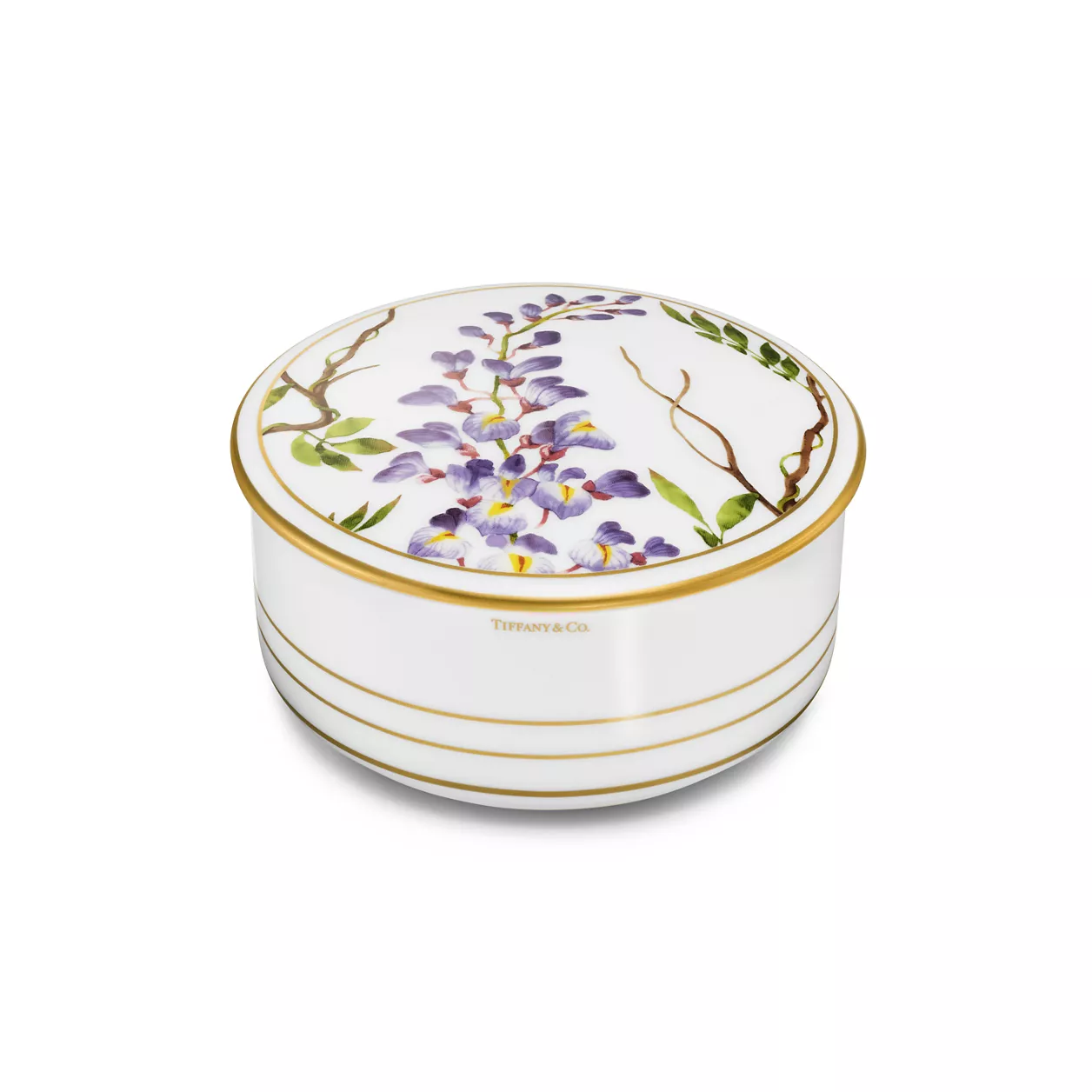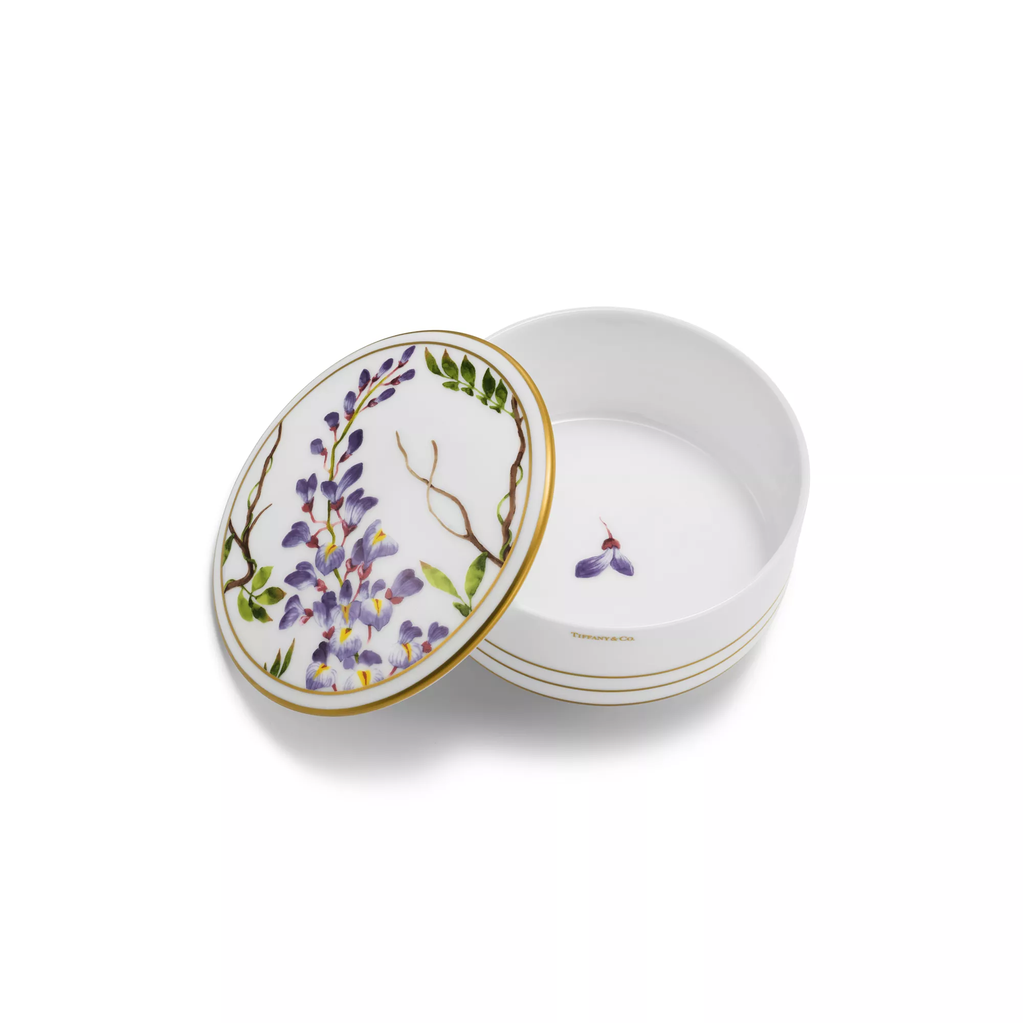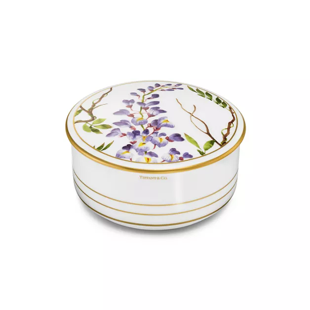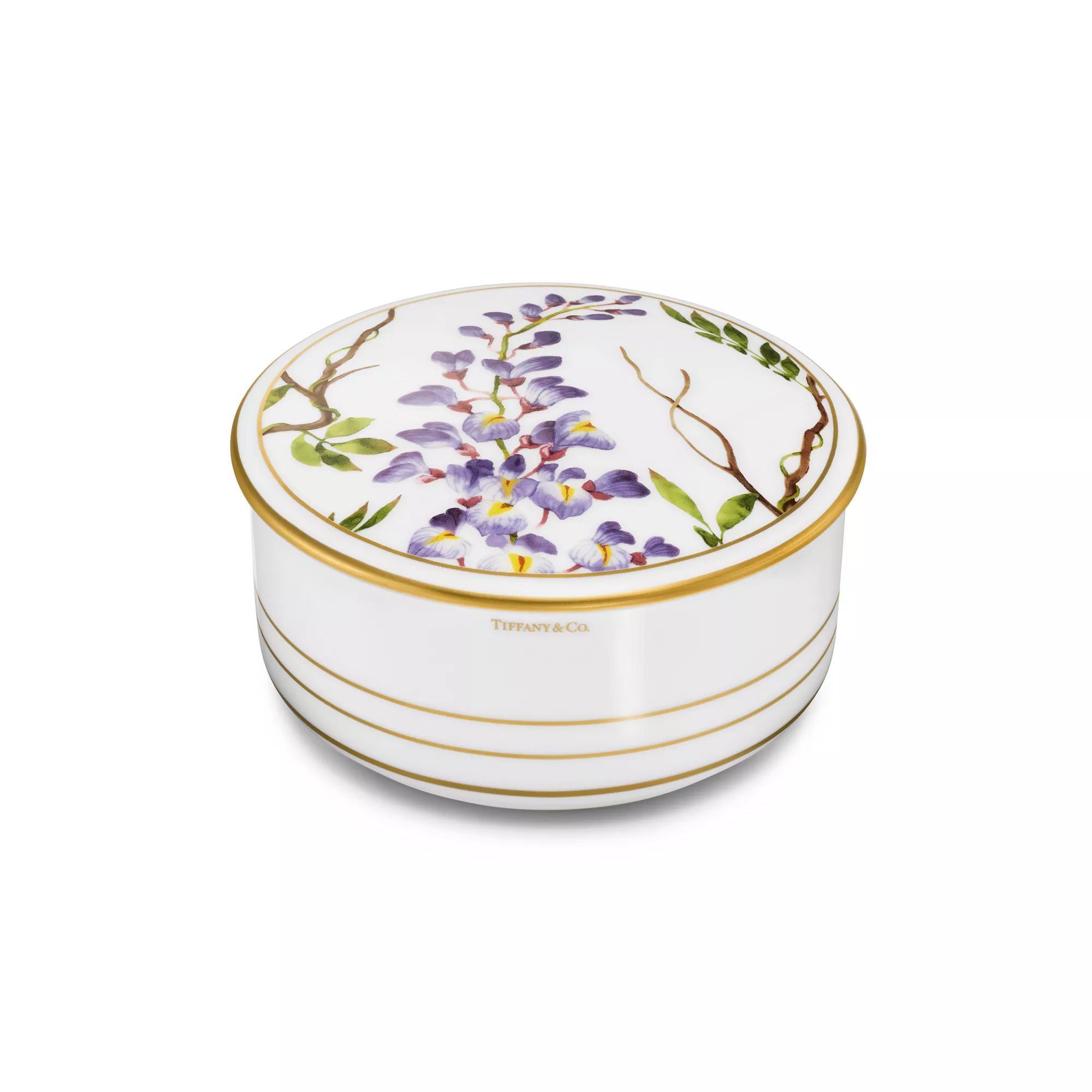 티파니 위스테리아 컬렉션은 위스테리아에서 영감을 받은 티파니 아카이브의 명작을 연상시킵니다. 모티프를 재해석하여 꽃무늬를 통해 클래식하고 페미닌한 우아함을 담았습니다. 본차이나로 제작되어 핸드 페인팅된 골드 림이 매력적인 이 박스에 가장 소중한 아이템을 보관할 수 있습니다.