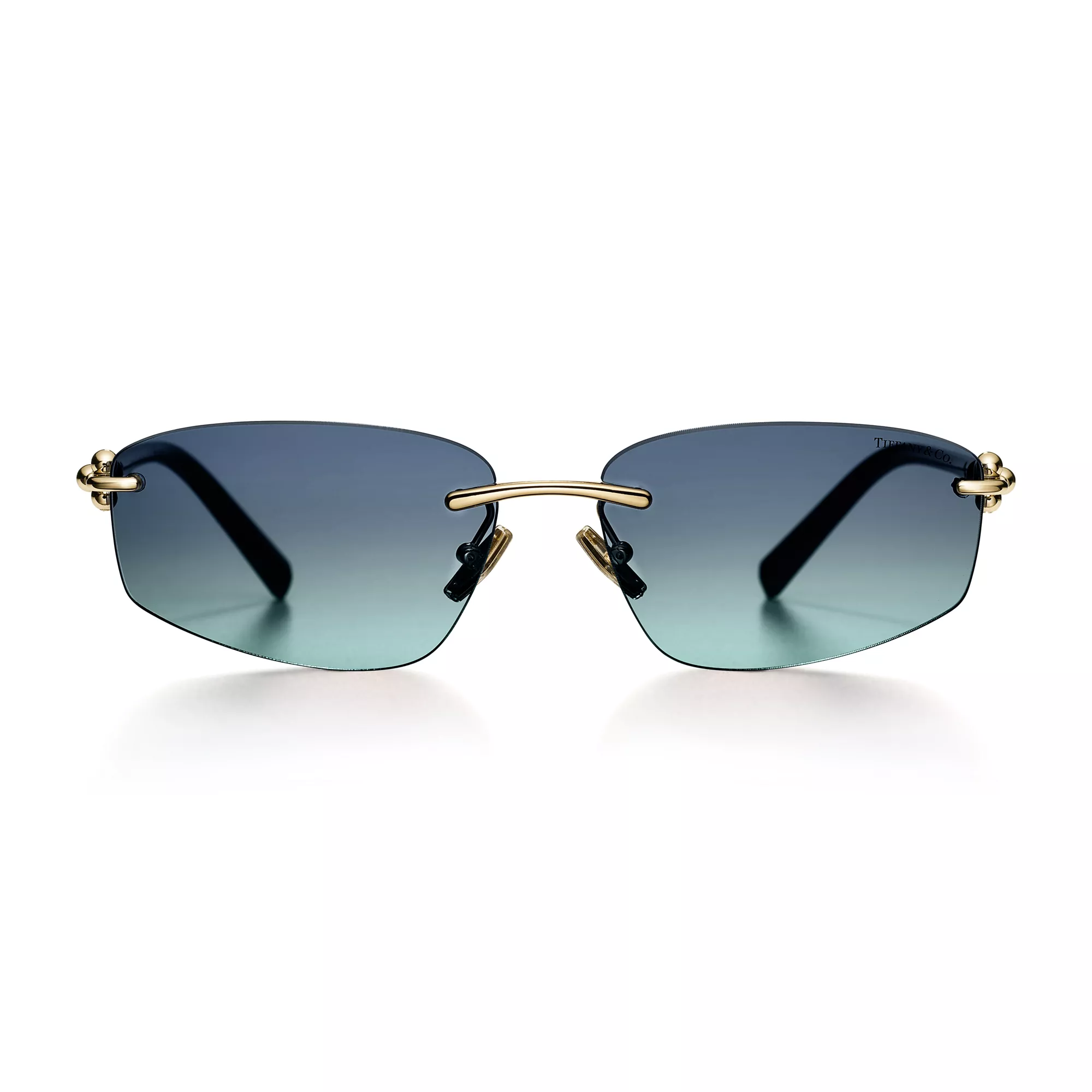 티파니 하드웨어는 뉴욕의 에너지와 애티튜드에서 영감을 받았습니다. 주얼리 컬렉션을 대표하는 디자인 코드에서 영감을 받은 선글라스는 템플에 힌지로 장식된 시그니처 게이지 링크가 특징입니다. 페일 골드 컬러의 메탈 림리스 프레임에 티파니 블루 그래디언트 직사각형 렌즈가 매력적입니다.