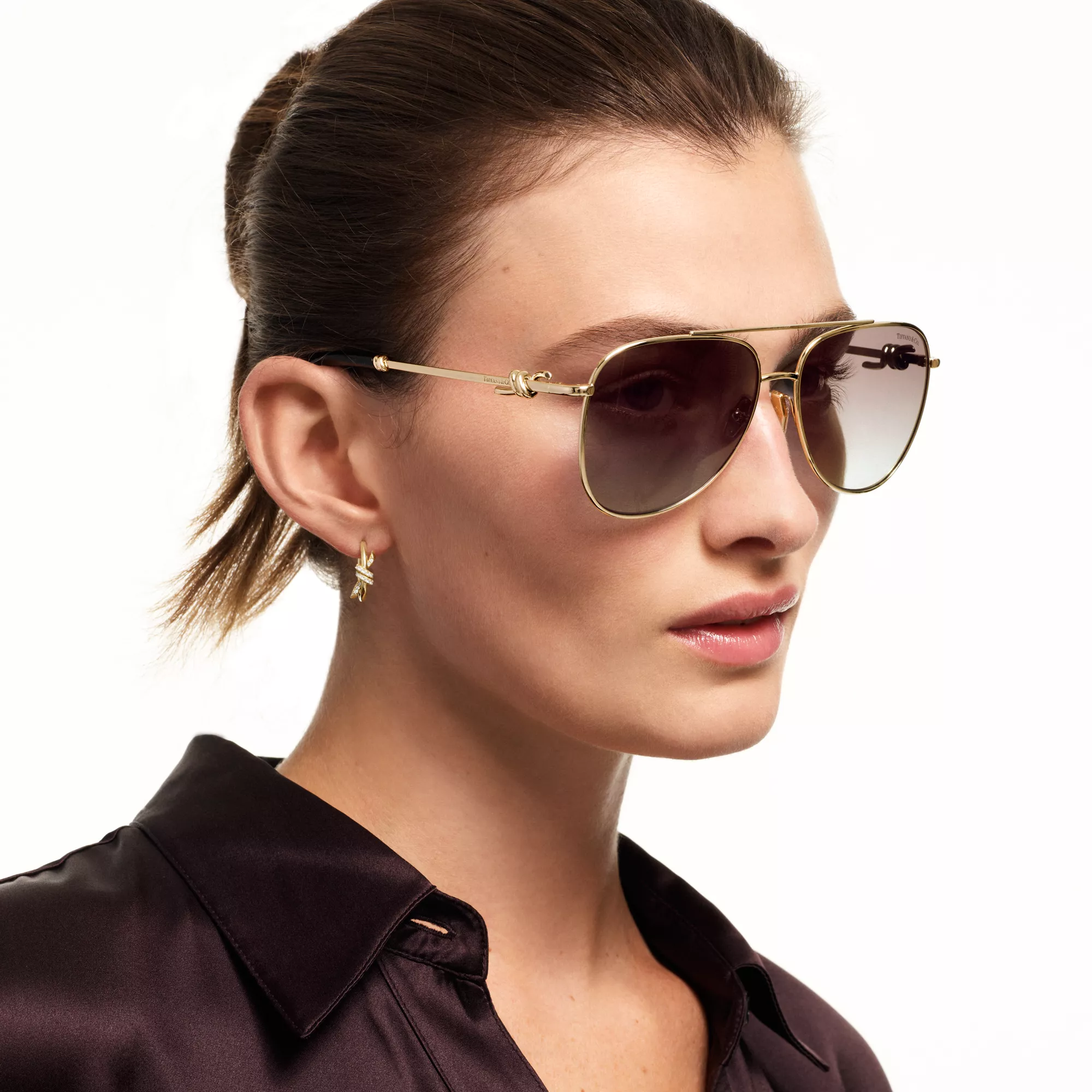 티파니 노트는 사랑의 변치 않는 결속을 표현합니다. 주얼리 컬렉션을 대표하는 디자인 코드에서 영감을 받아 탄생한 선글라스는, 템플의 시그니처 매듭 모티프와 편안함을 더하는 아세테이트 팁이 특징입니다. 페일 골드 컬러 메탈 프레임에 라이트 브라운 파일럿 렌즈가 매력적입니다.