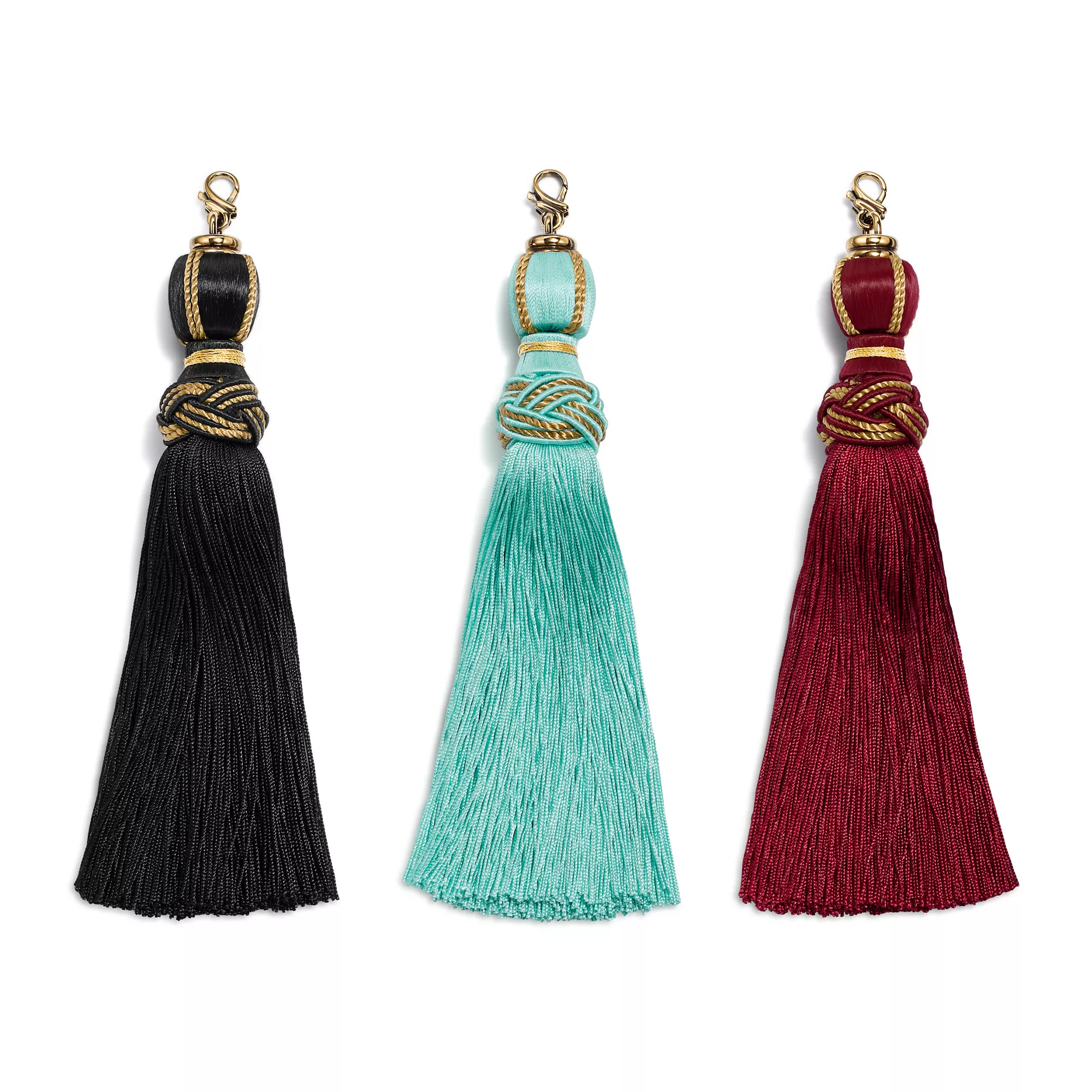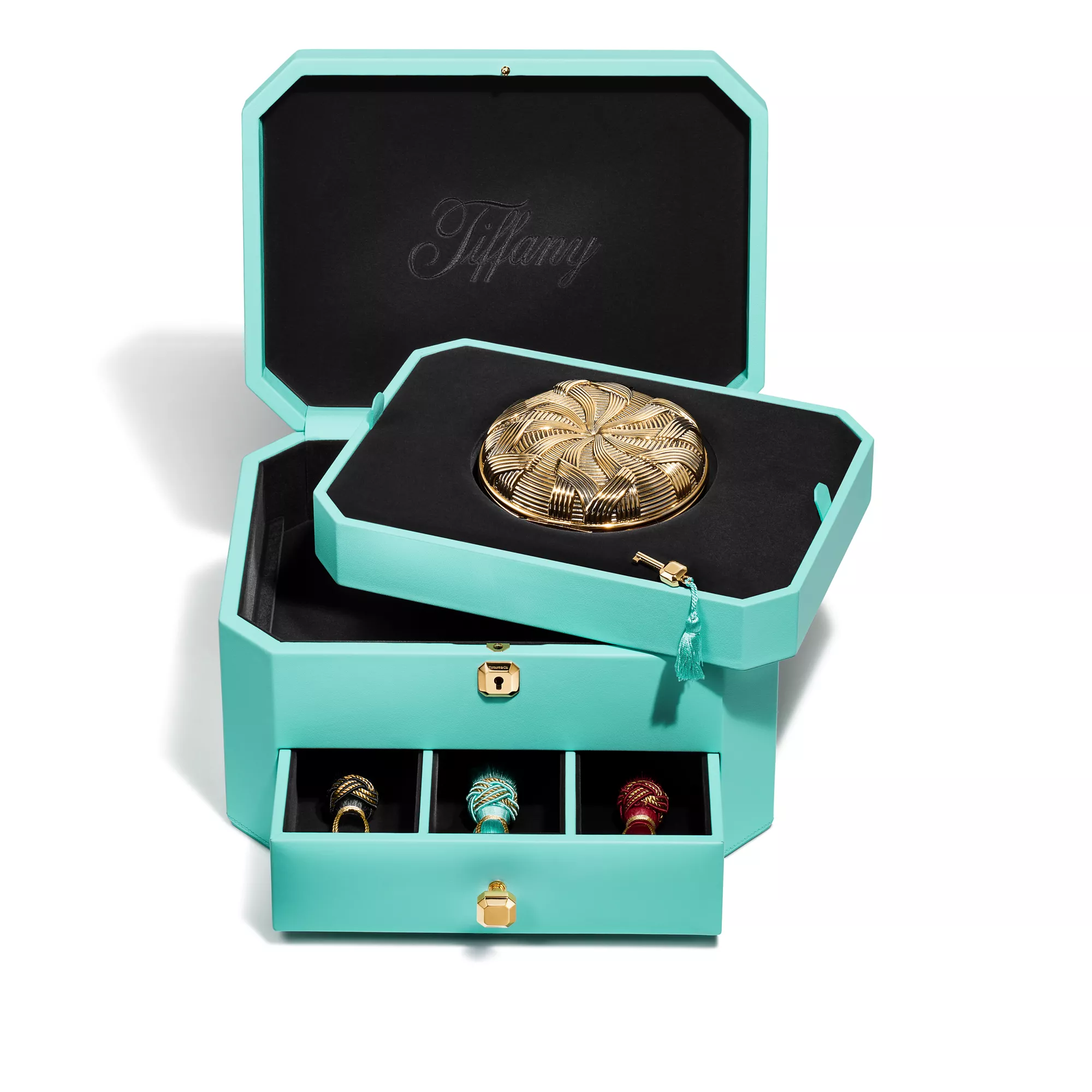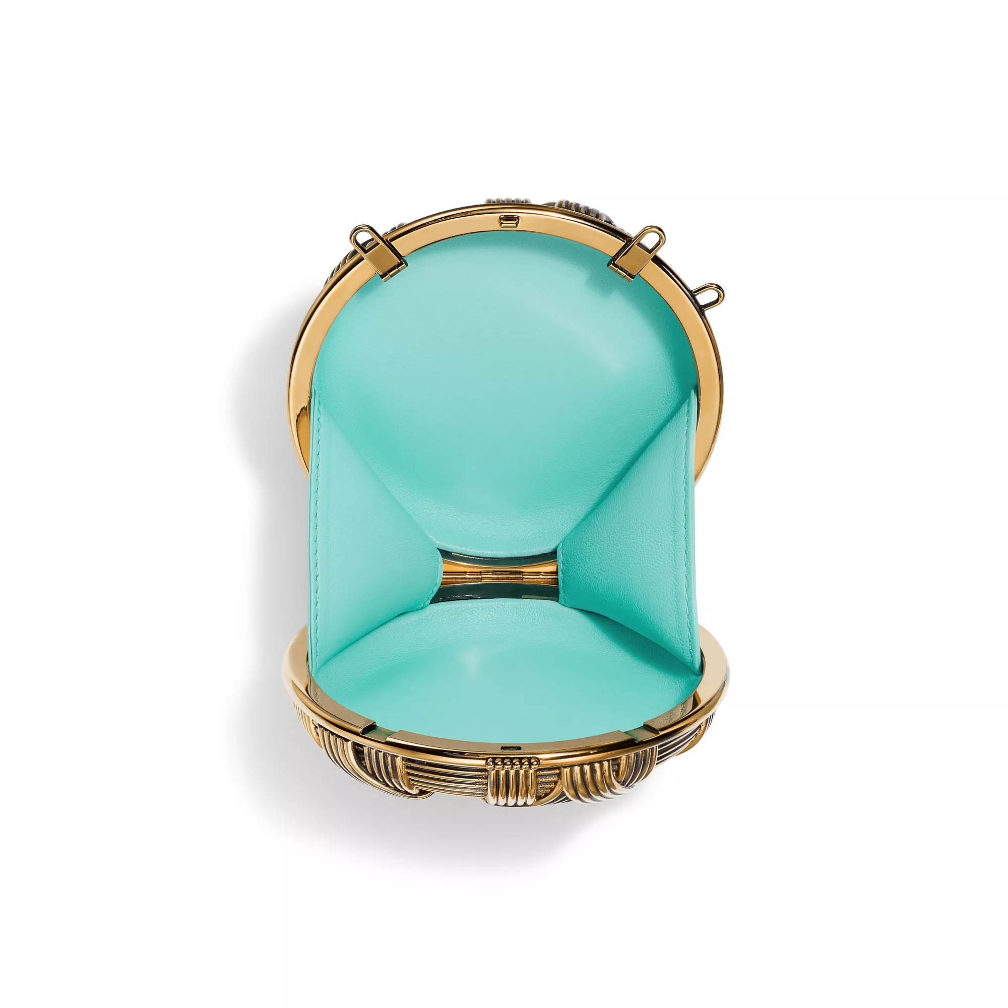 Jean Schlumberger by Tiffany Ribbons 컬렉션은 텍스타일 업계에서 일했던 전설적인 디자이너의 가족의 역사와 그의 작품에 자주 등장하는 화려한 트리밍에서 영감을 받았습니다. 골드 도금 브라스로 제작된 이 백은 탈부착 가능한 태슬 3개, 내부 포켓 1개, 탈부착 가능한 거울 1개가 특징입니다. 클로저는 쟌 슐럼버제가 1957년에 디자인한 컴팩트한 거울에서 선보인 모티프를 떠올리게 합니다.