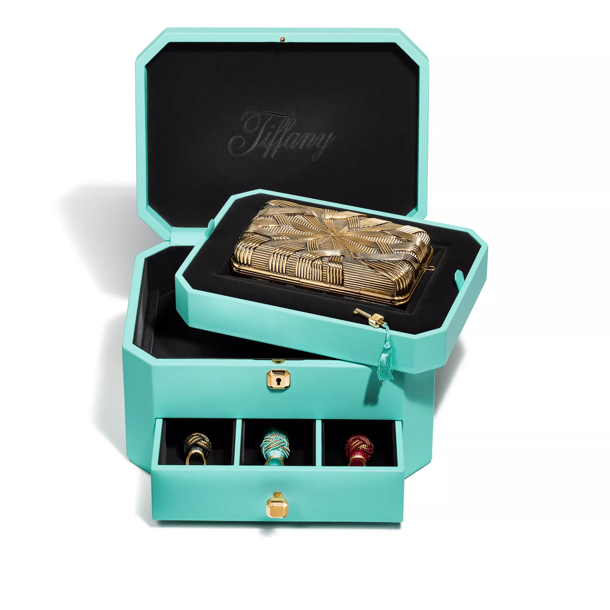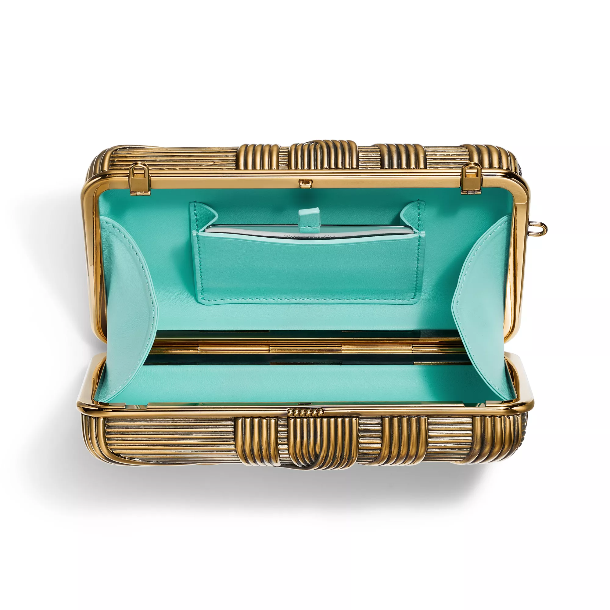 Jean Schlumberger by Tiffany Ribbons 컬렉션은 텍스타일 업계에서 일했던 전설적인 디자이너의 가족의 역사와 그의 작품에 자주 등장하는 화려한 트리밍에서 영감을 받았습니다. 골드 도금 브라스로 제작된 이 백은 탈부착 가능한 태슬 3개, 쟌 슐럼버제가 1957년에 디자인한 컴팩트한 거울에서 선보인 모티프를 담은 클로저 1개가 특징입니다.