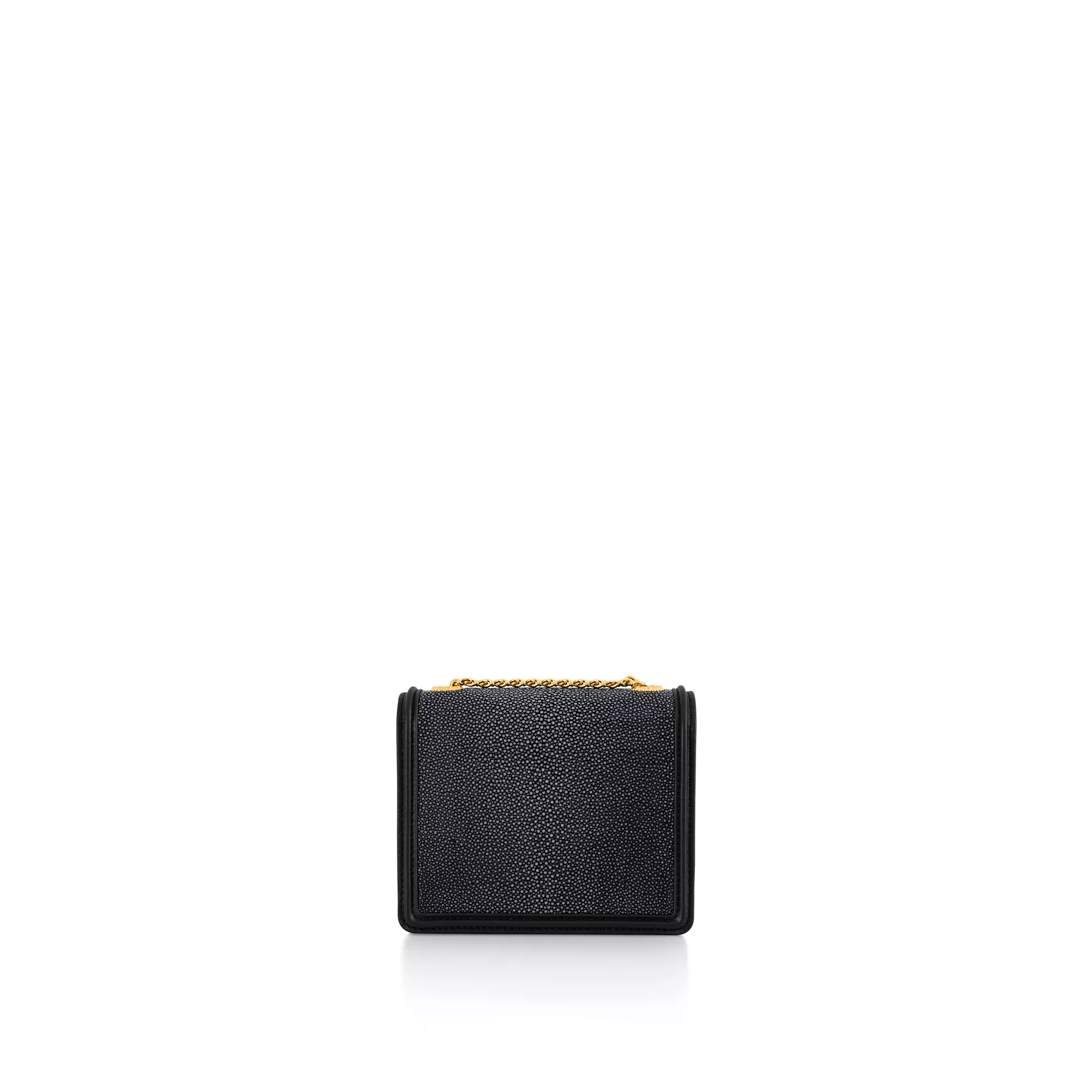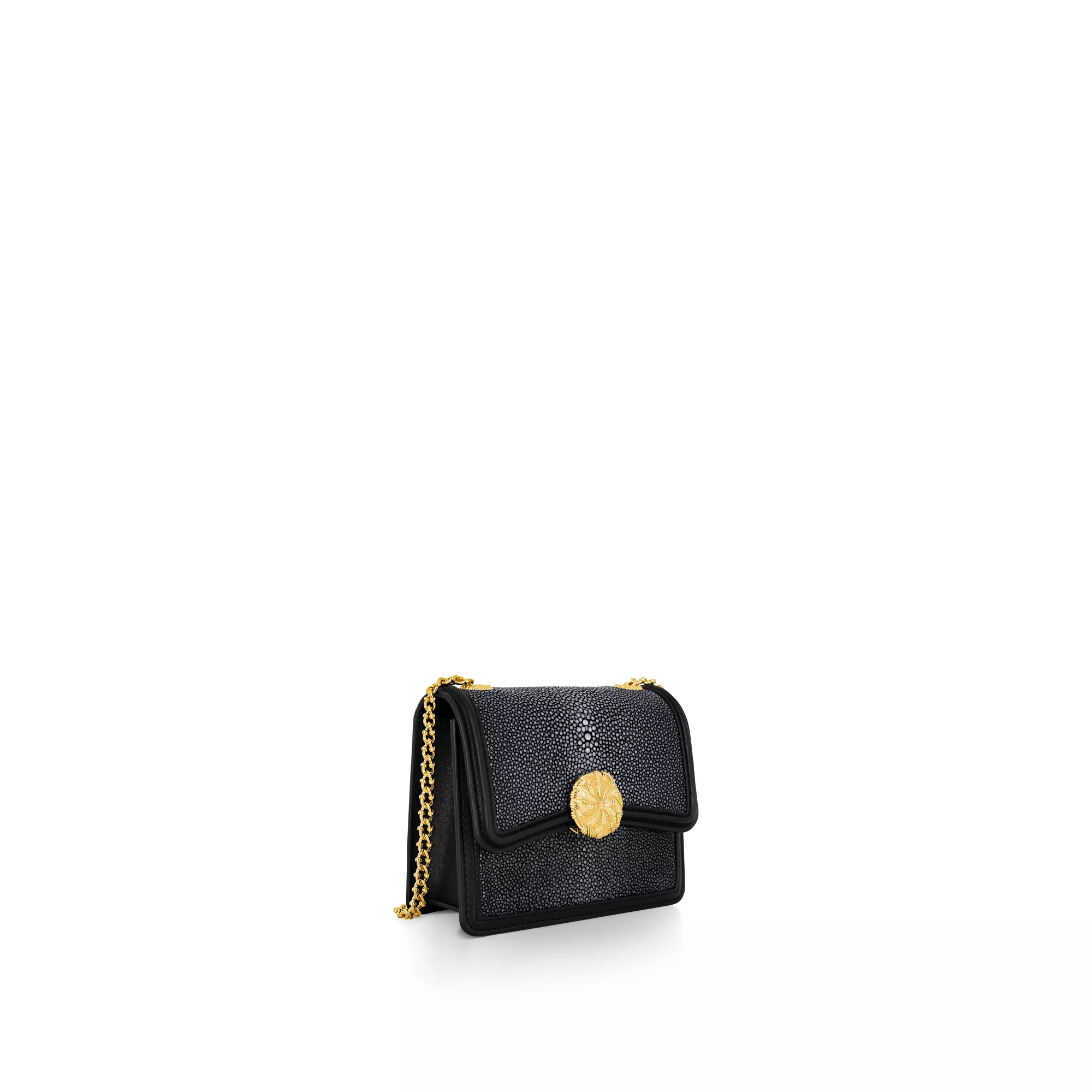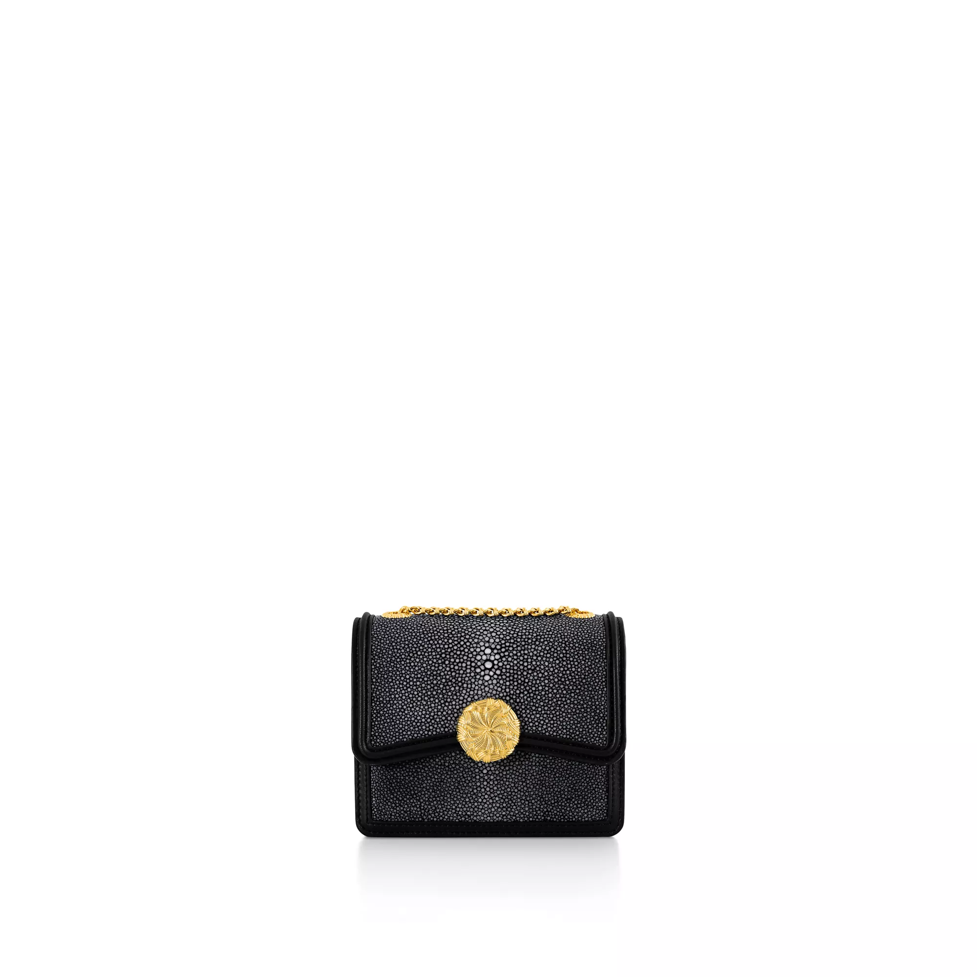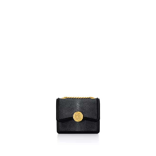 Jean Schlumberger by Tiffany Ribbons 컬렉션은 텍스타일 업계에서 일했던 전설적인 디자이너의 가족의 역사와 그의 작품에 자주 등장하는 화려한 트리밍에서 영감을 받아 탄생하였습니다. 스팅레이 레더로 제작된 이 백은 티파니 블루 컬러의 안감이 있는 앞면 슬립 포켓 1개, 탈부착 가능한 거울 1개가 있는 뒷면 내부 포켓 1개가 특징입니다. 골드 도금 브라스 클로저는 쟌 슐럼버제가 1957년에 디자인한 컴팩트한 거울에서 선보인 모티프를 떠올리게 합니다.