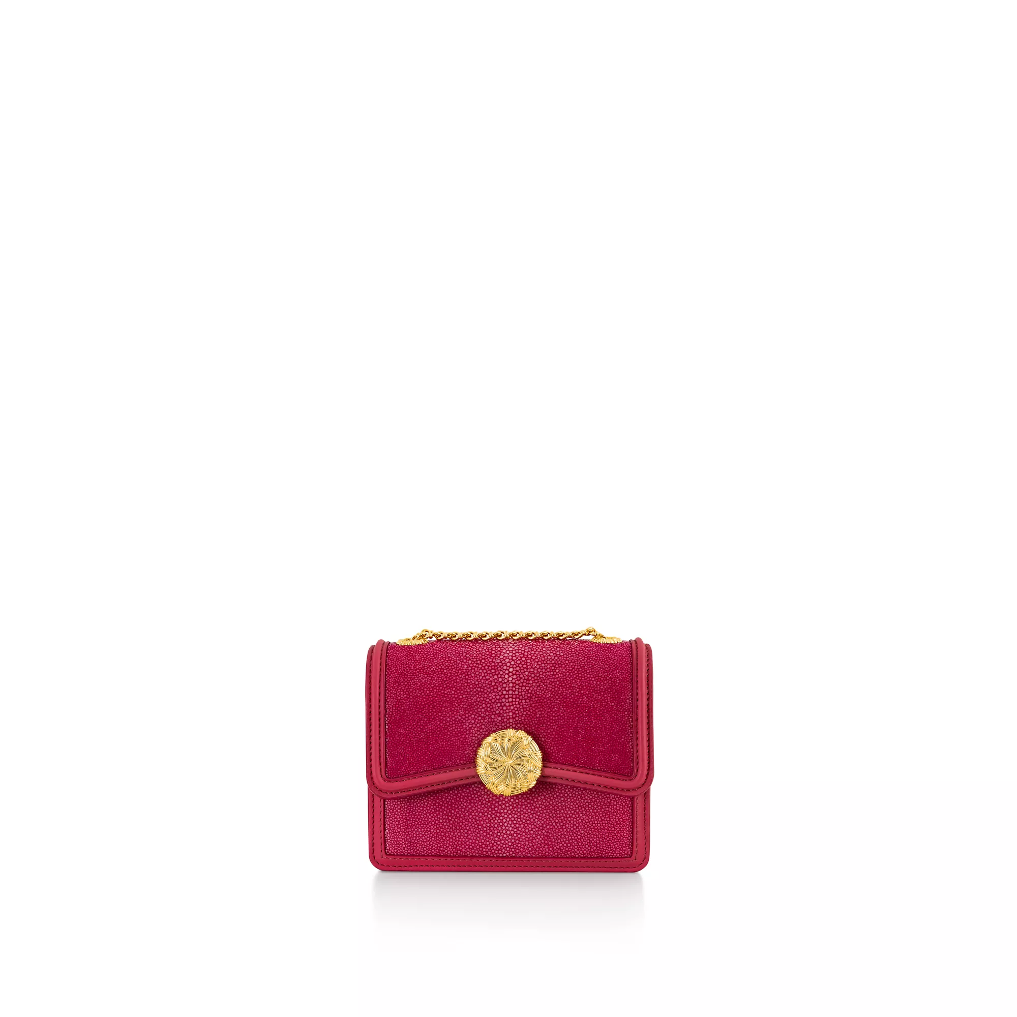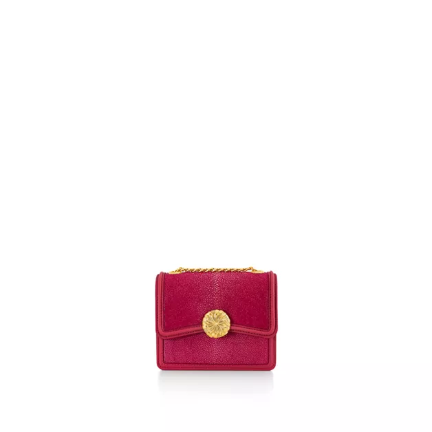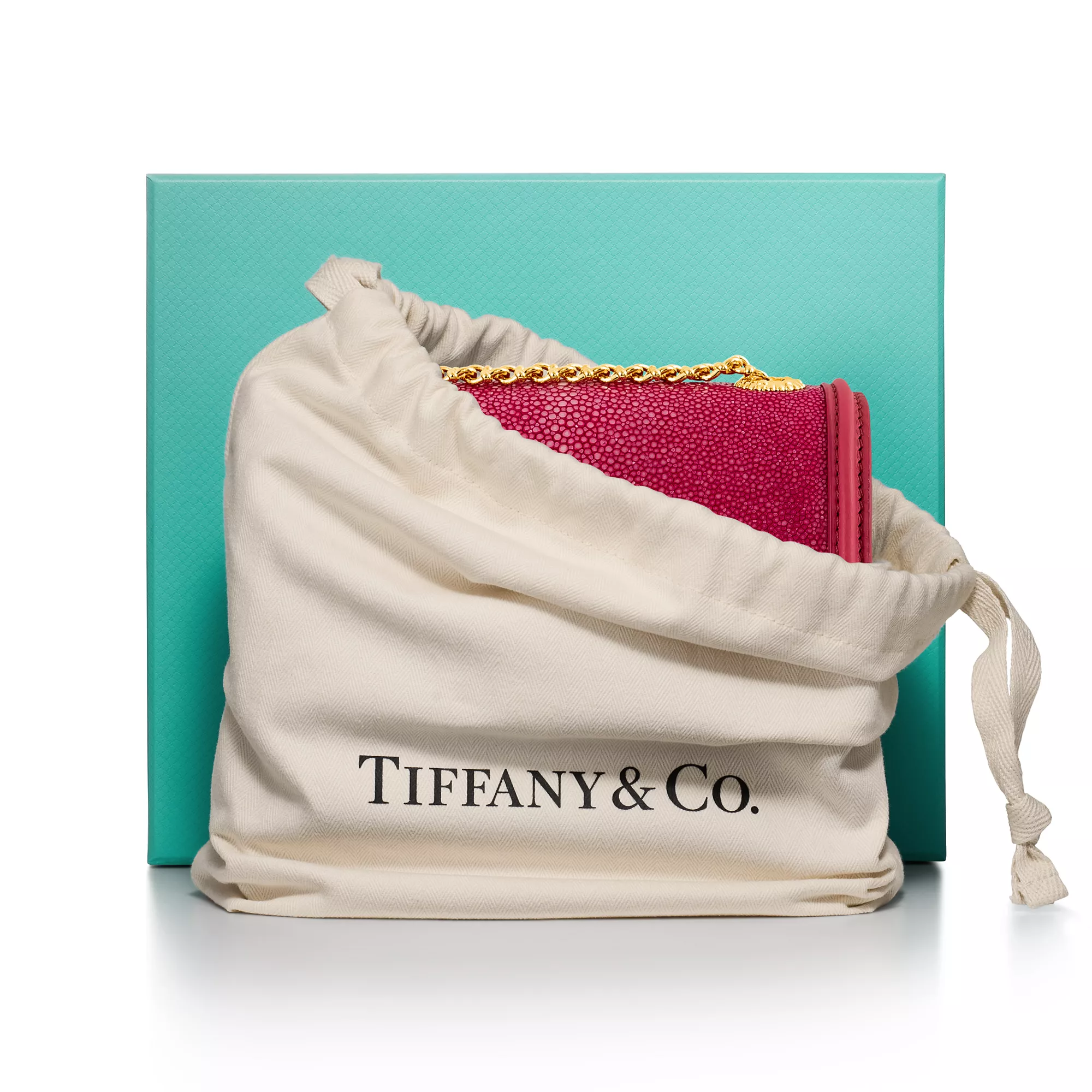 Jean Schlumberger by Tiffany Ribbons 컬렉션은 텍스타일 업계에서 일했던 전설적인 디자이너의 가족의 역사와 그의 작품에 자주 등장하는 화려한 트리밍에서 영감을 받았습니다. 스팅레이 레더로 제작된 이 백은 티파니 블루 컬러의 안감이 있는 앞면 슬립 포켓 1개, 탈부착 가능한 거울 1개가 있는 뒷면 내부 포켓 1개가 특징입니다. 골드 도금 브라스 클로저는 쟌 슐럼버제가 1957년에 디자인한 컴팩트한 거울에서 선보인 모티프를 떠올리게 합니다.