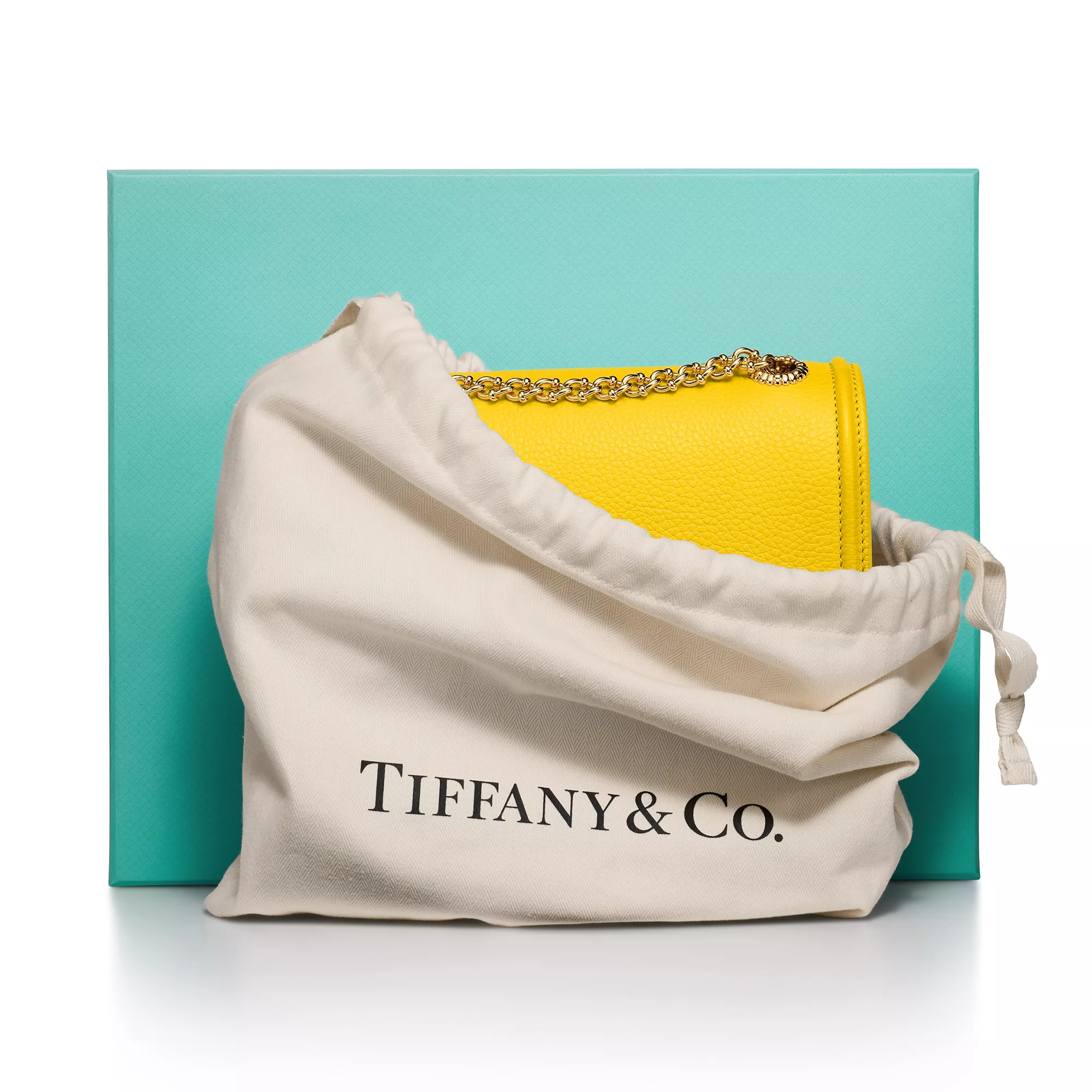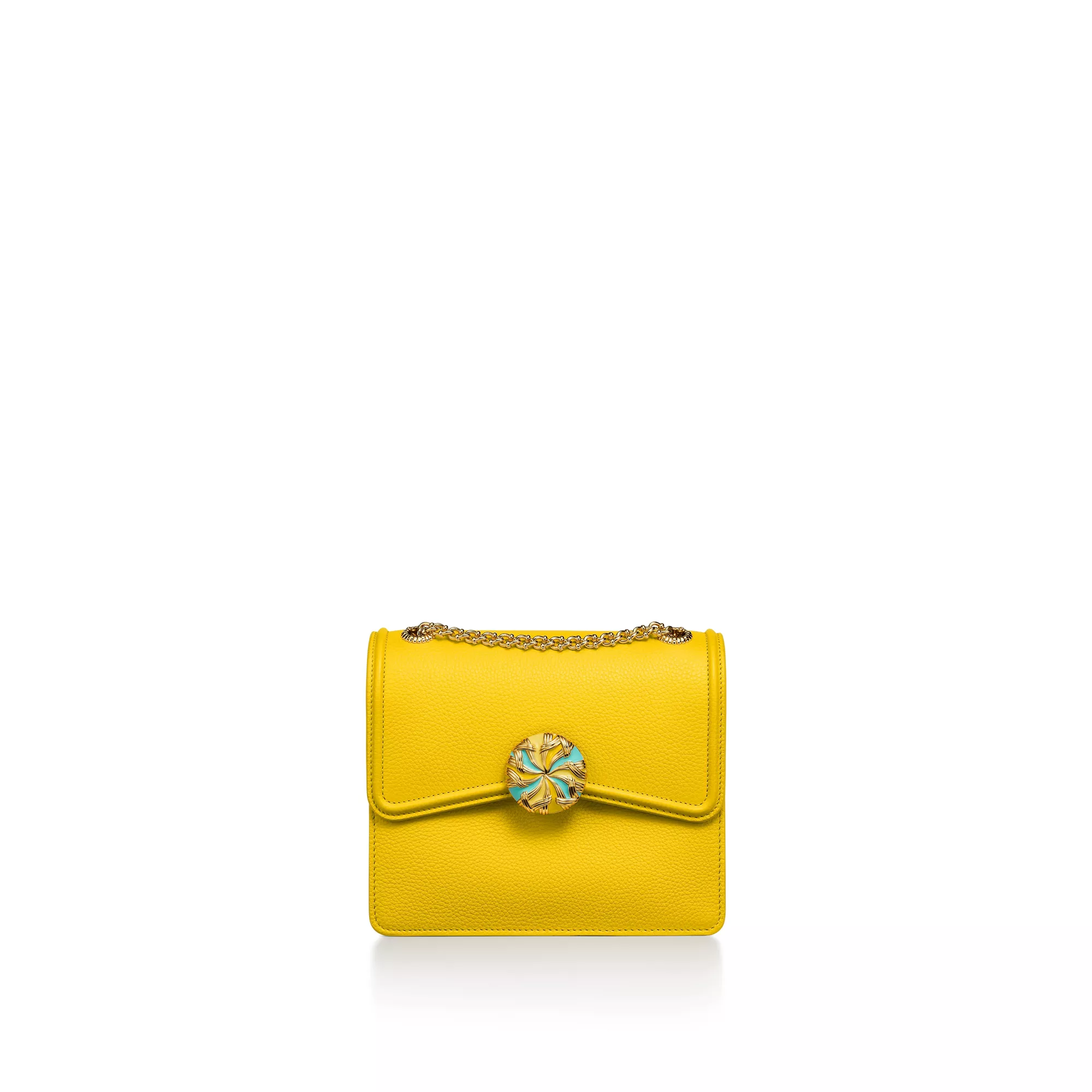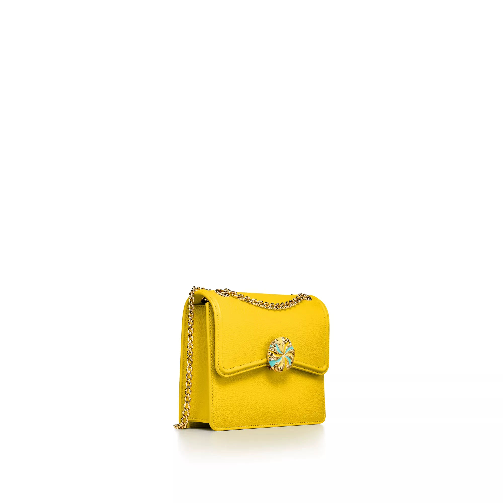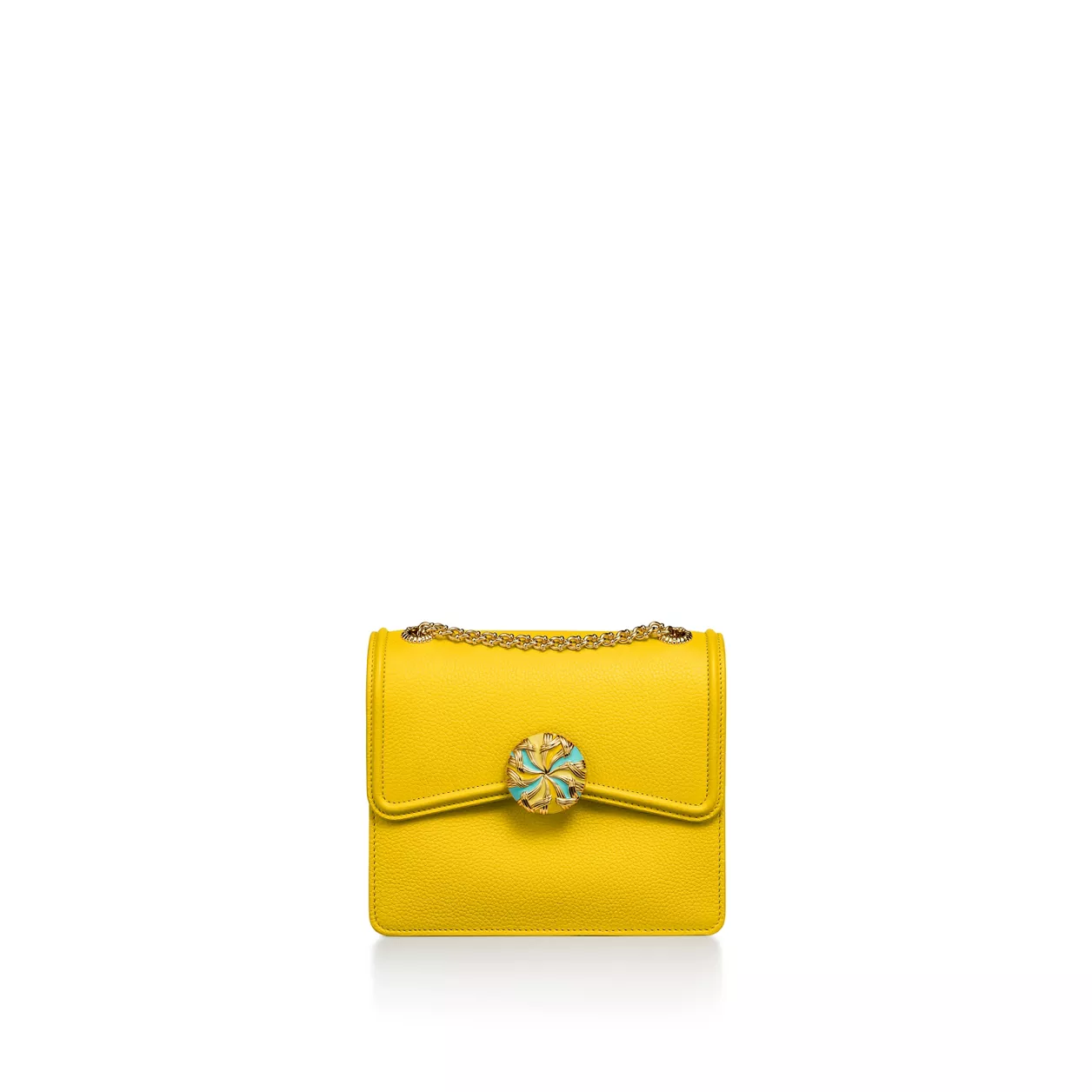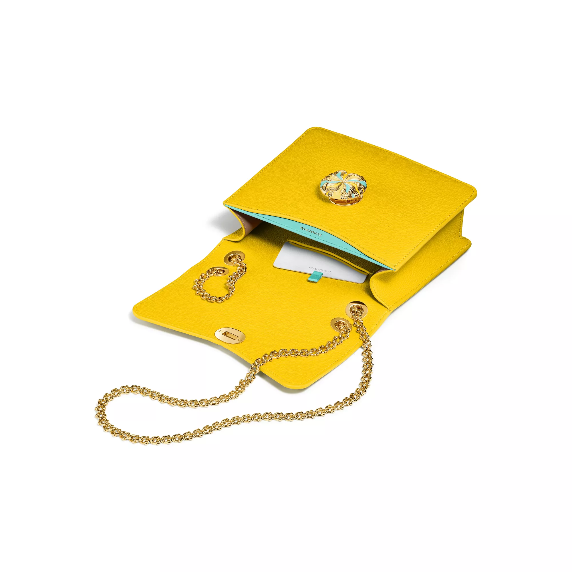 Jean Schlumberger by Tiffany Ribbons 컬렉션은 텍스타일 업계에서 일했던 전설적인 디자이너의 가족의 역사와 그의 작품에 자주 등장하는 화려한 트리밍에서 영감을 받았습니다. 그레인드 레더로 제작된 이 백은 티파니 블루 컬러의 안감이 있는 앞면 슬립 포켓 1개, 탈부착 가능한 거울 1개가 있는 뒷면 내부 포켓 1개가 특징입니다. 옐로우 에나멜과 골드 도금 브라스 클로저는 쟌 슐럼버제가 1957년에 디자인한 컴팩트한 거울에서 선보인 모티프를 떠올리게 합니다.