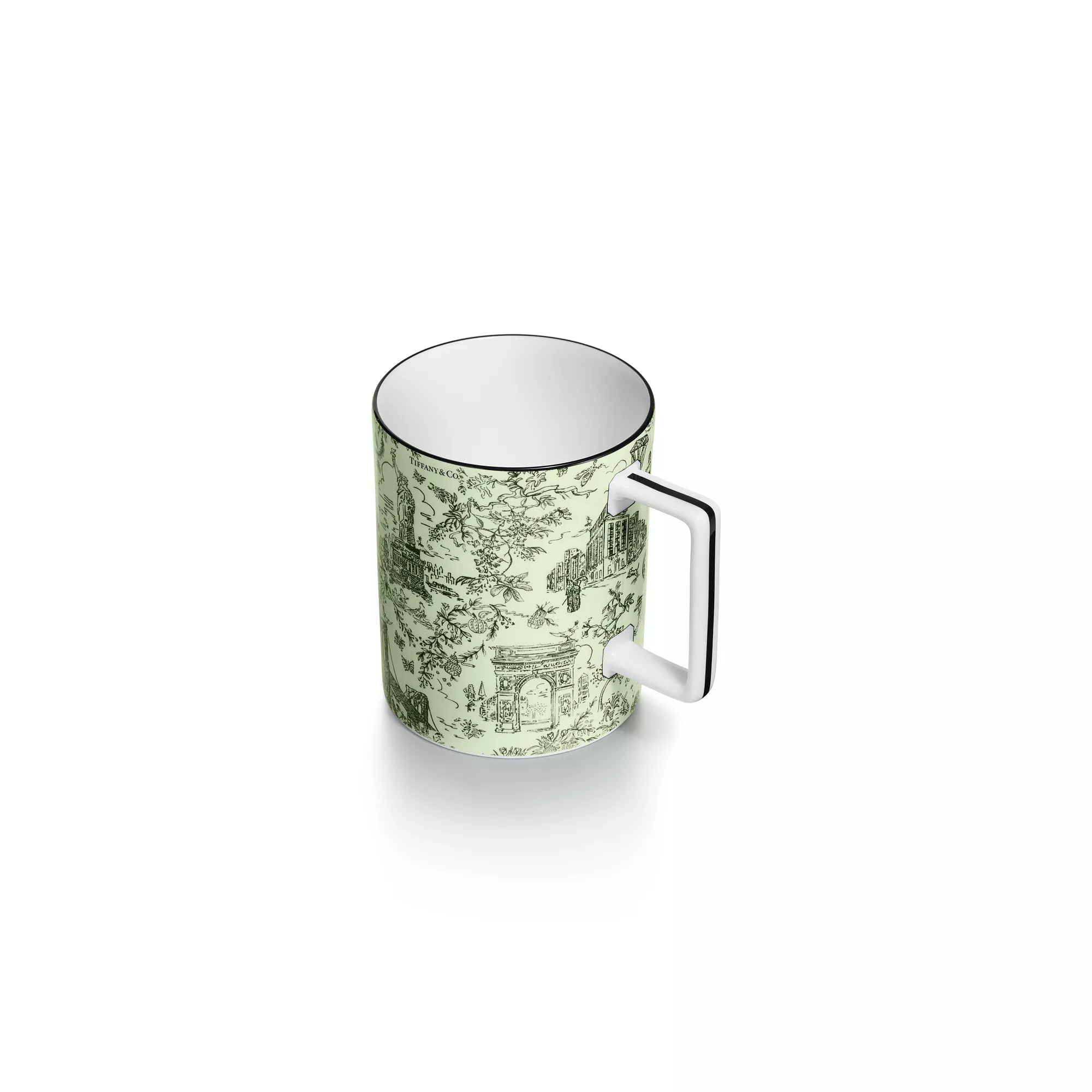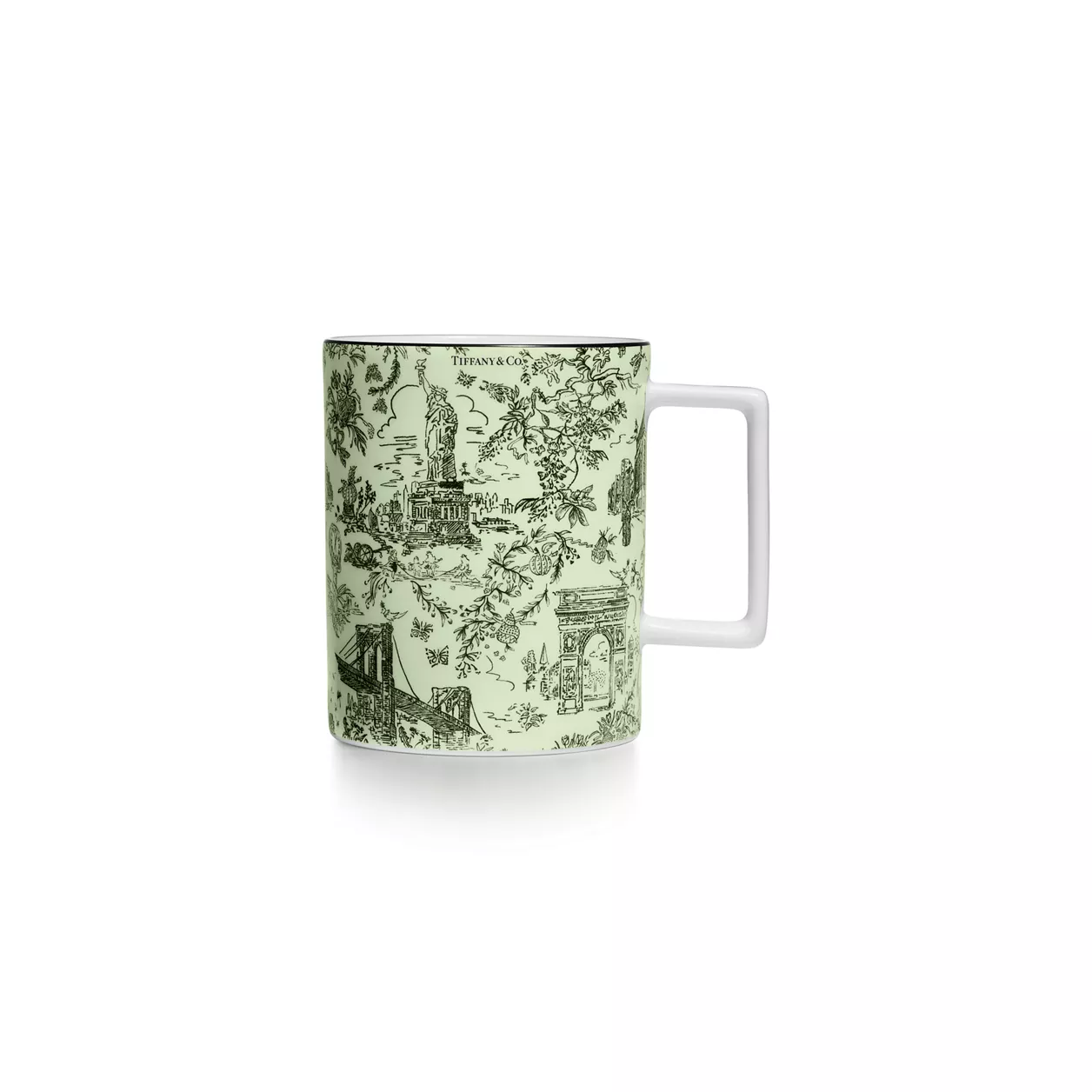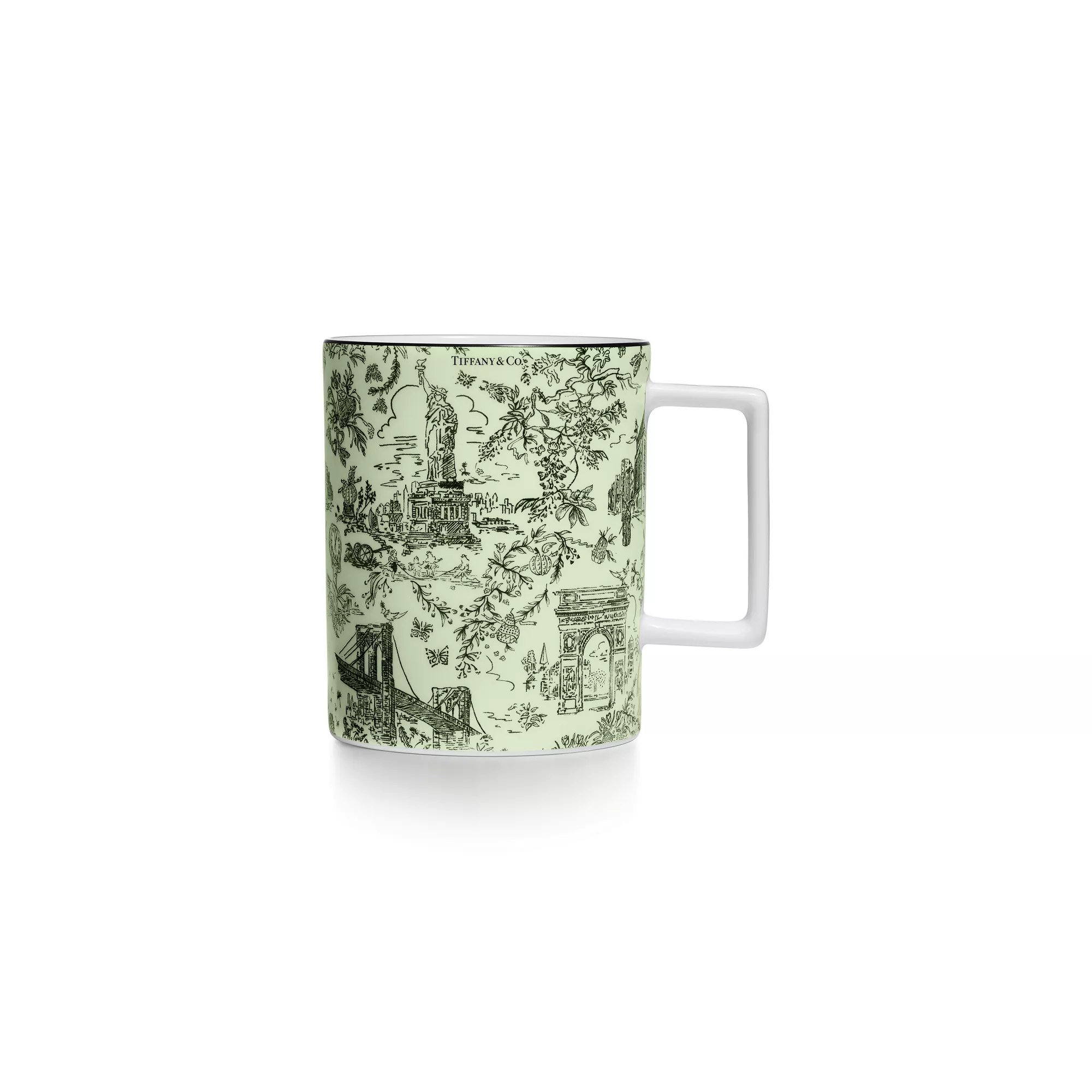 티파니의 기원과 헤리티지를 기리는 티파니 트왈 디자인을 만나보세요. 장난스러우면서도 우아한 이 작품은 티파니 아카이브의 뉴욕 일러스트에서 영감을 받아 탄생하였습니다. 버드 온 어 락과 브루클린 브릿지의 만남; 티파니 다이아몬드와 자유의 여신상. 차보라이트 색상의 머그는 핸드 페인팅된 블랙 림과 정교한 프린트가 특징입니다. 티파니 트왈 플레이트와 함께 연출해 나만의 세트를 만들어 보세요.