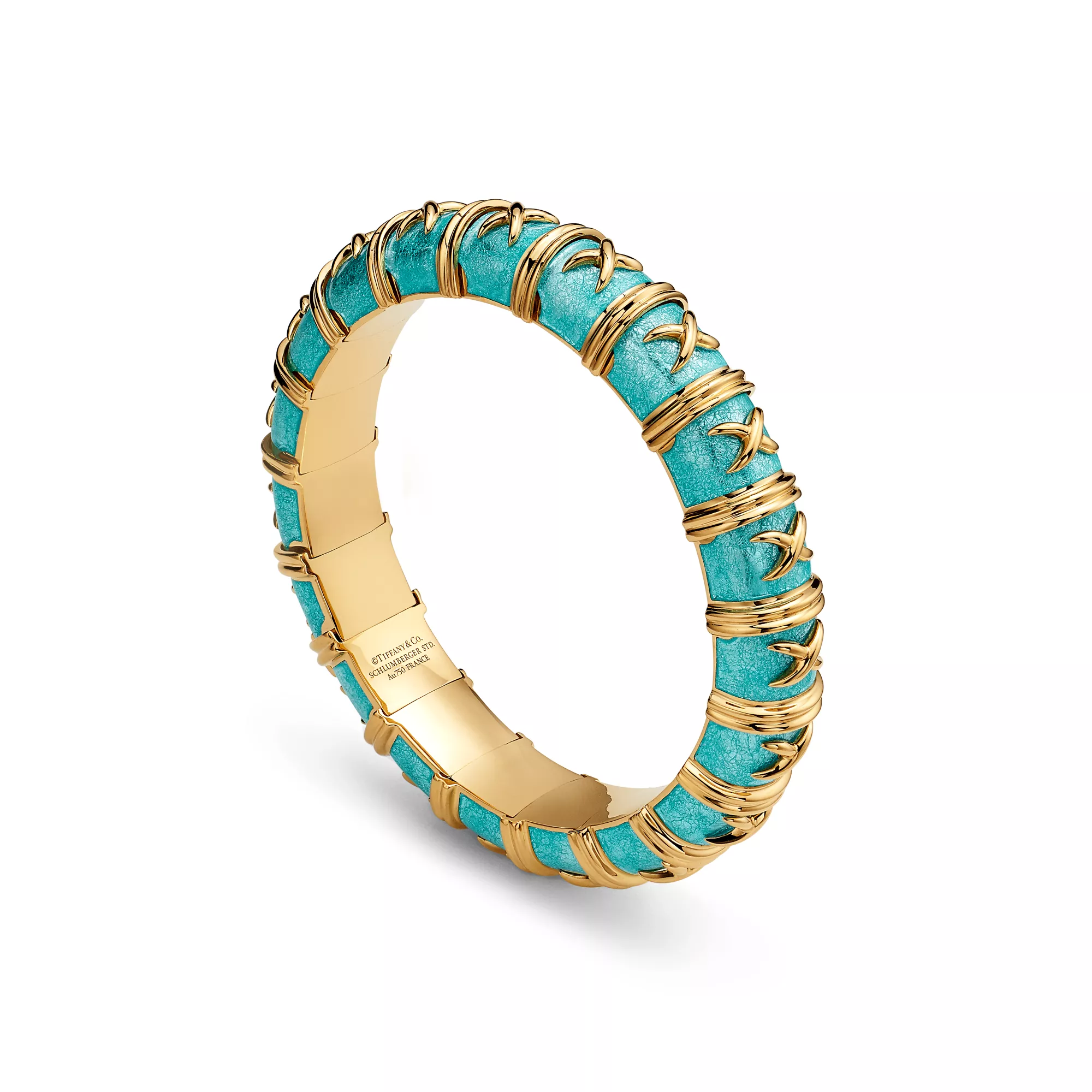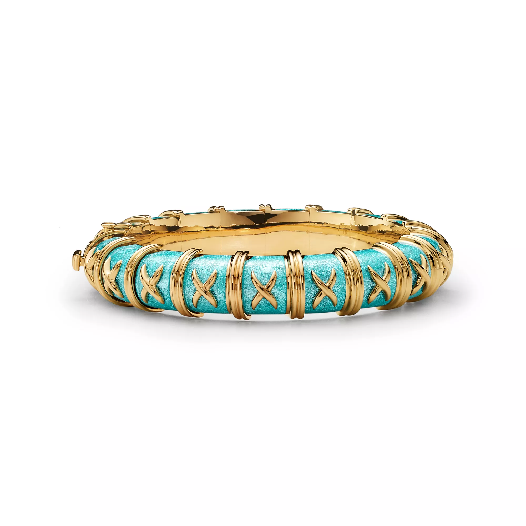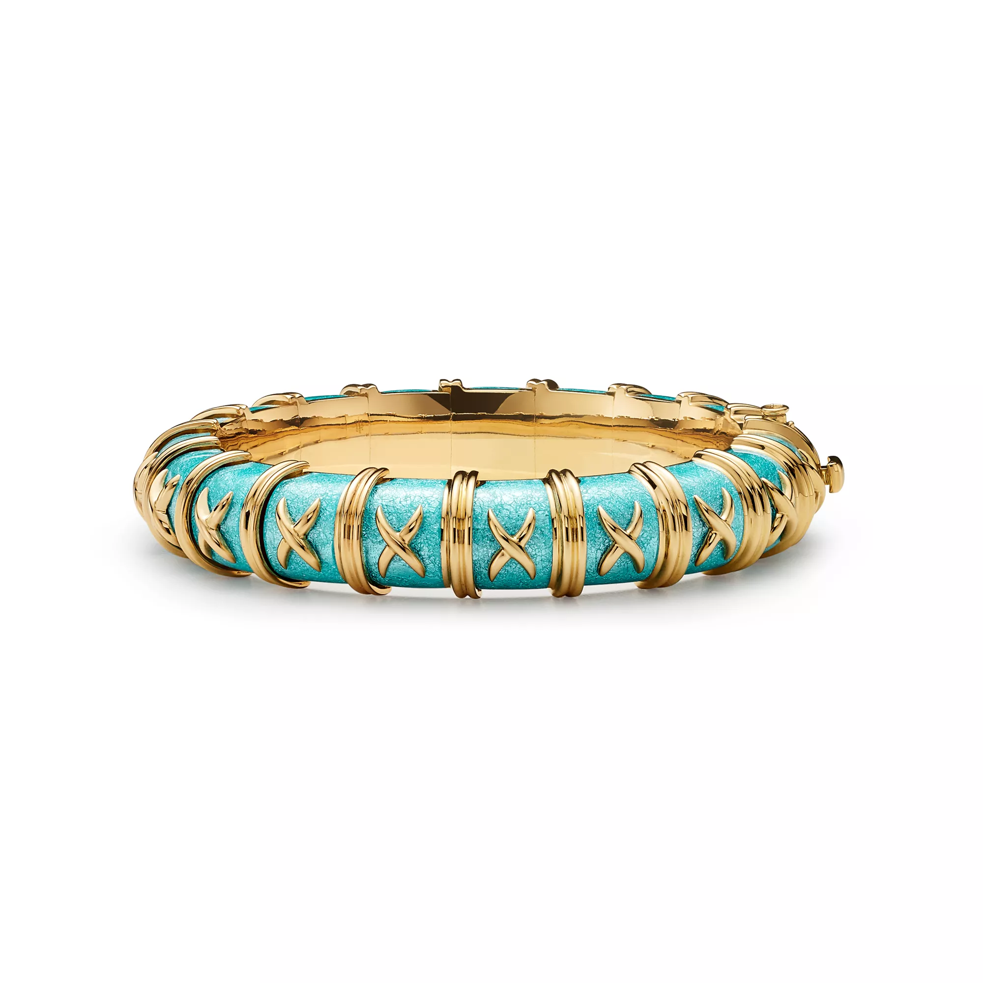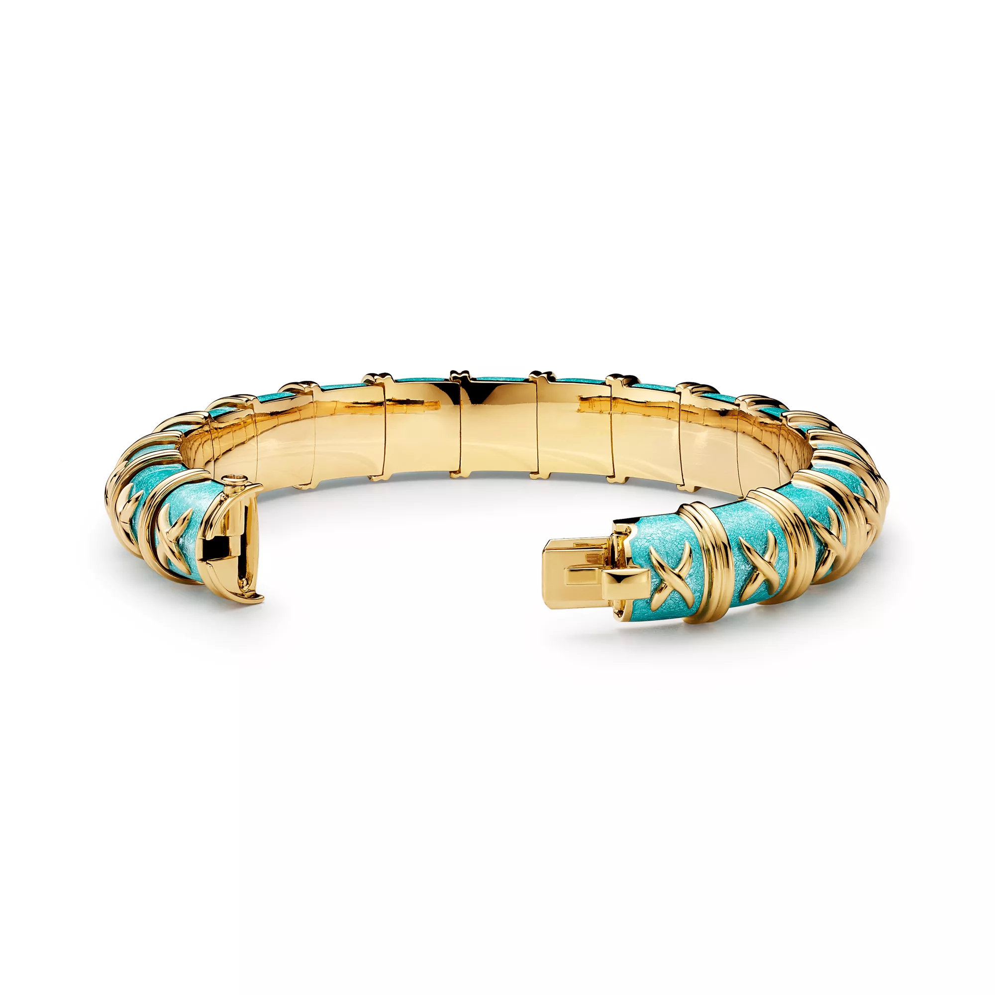 1962년 처음 등장한 쟌 슐럼버제의 컬러풀한 유리 에나멜 작품은 티파니의 가장 아이코닉한 주얼리 디자인 중 하나입니다. 19세기 에나멜 예술 양식은 에나멜을 여러 차례 파이어링하여 섬세하게 레이어링하는 복잡하고 노동 집약적인 과정을 거칩니다. 쟌 슐럼버제의 시그니처 파요네 피스는 에나멜에 고급 골드 포일을 여러 차례 반복 레이어링하여 특별한 깊이와 반짝이는 광채를 가진 풍부한 색조를 연출했습니다. 전 세계에서 이처럼 유서깊은 기술과 예술성을 구사할 수 있는 장인은 찾아보기 어렵습니다. 디자인 역사에 한 획을 그은 쟌 슐럼버제의 웅장한 에나멜 브레이슬릿은 골드와 젬스톤으로 아름답게 액센트를 주었습니다.