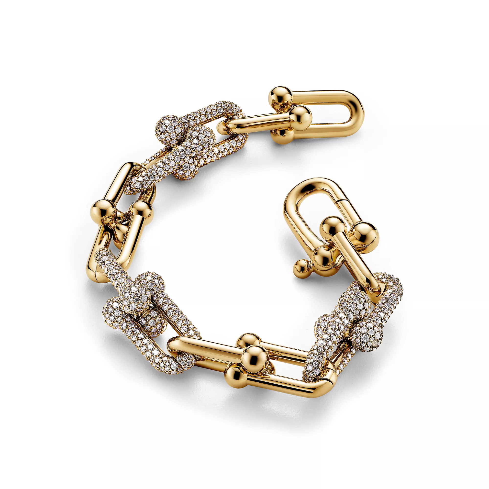 티파니 하드웨어는 사랑, 그 진정한 변화의 힘을 표현합니다. 티파니 1962년 아카이브에서 발견한 클래식한 브레이슬릿에서 영감을 얻은 하드웨어는 지속적인 회복력과 자유로운 정신을 구현합니다. 시선을 사로잡는 18K 옐로우 골드와 다이아몬드가 강렬한 대조를 이루는 티파니 하드웨어 컬렉션의 시그니처 게이지 링크 브레이슬릿입니다. 다이아몬드의 광채를 최대한 살릴 수 있도록 티파니 장인들이 다이아몬드 하나하나를 섬세하게 핸드 세팅했습니다. 링크에 감춰진 클로저가 매끄럽게 하나로 연결된 룩을 완성합니다. 단독으로 착용하거나 다른 메탈 아이템과 믹스해 아름답게 연출할 수 있습니다.
