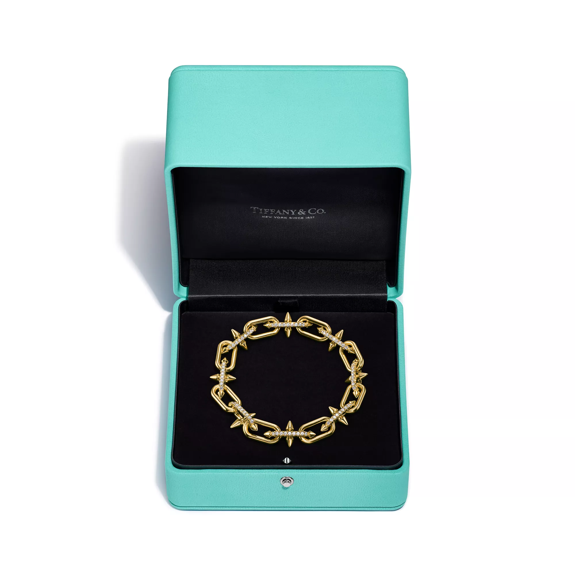 티파니의 유산을 이어 선구적인 아티스트와의 협업을 선보이는 티파니 타이탄 by 퍼렐 윌리엄스는 창의성을 불러일으키는 촉매로 저항 정신을 표현하였습니다. 포세이돈과 그의 삼지창에서 영감을 얻은 디자인을 선보입니다. 18K 골드로 제작된 각진 창 쉐입의 모티프와 부드러운 곡선의 링크가 강렬한 룩을 선사합니다. 링크에 감춰진 잠금장치가 매끄럽게 하나로 연결된 흐름을 완성합니다. 피쉬테일 다이아몬드를 통해 모든 각도에서 빛을 받아들여 최상의 광채를 선보입니다.