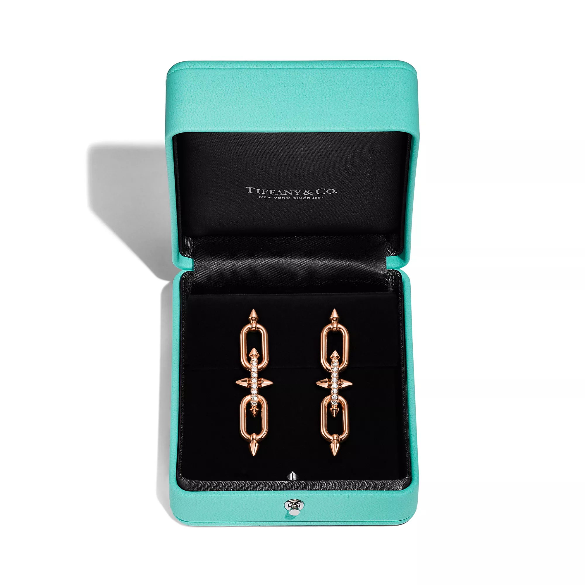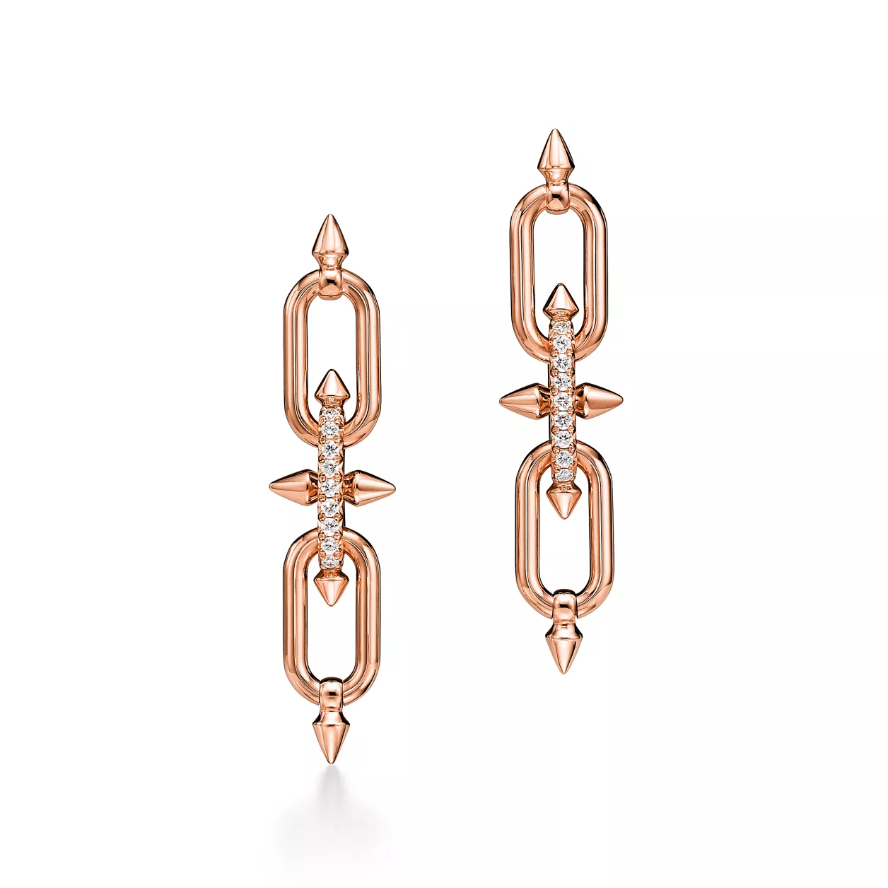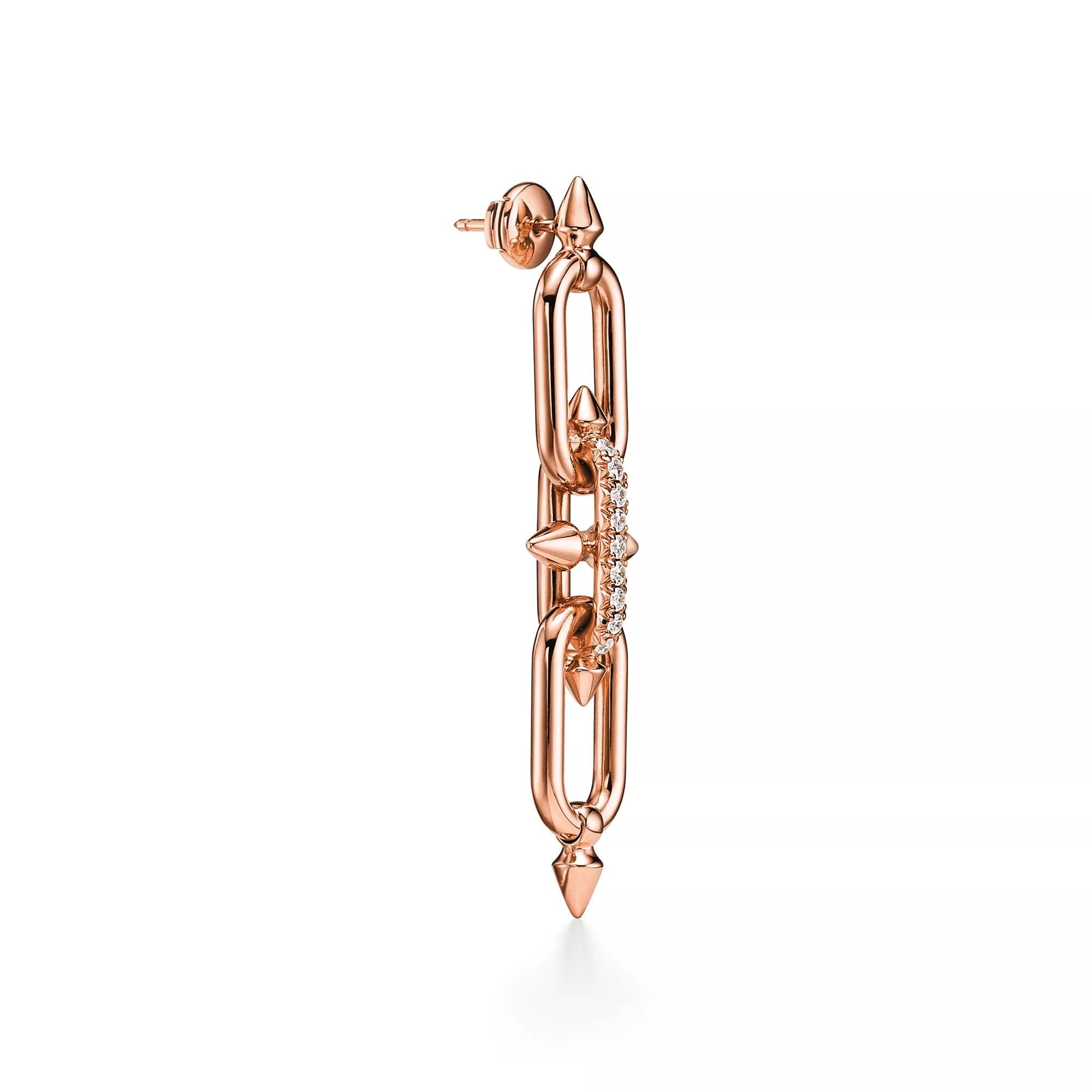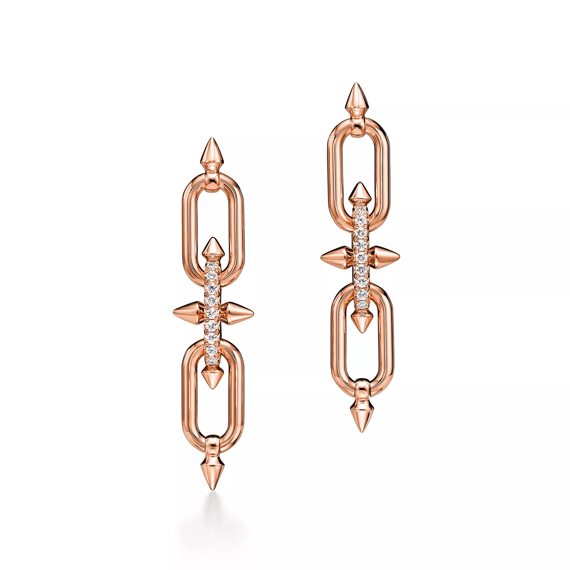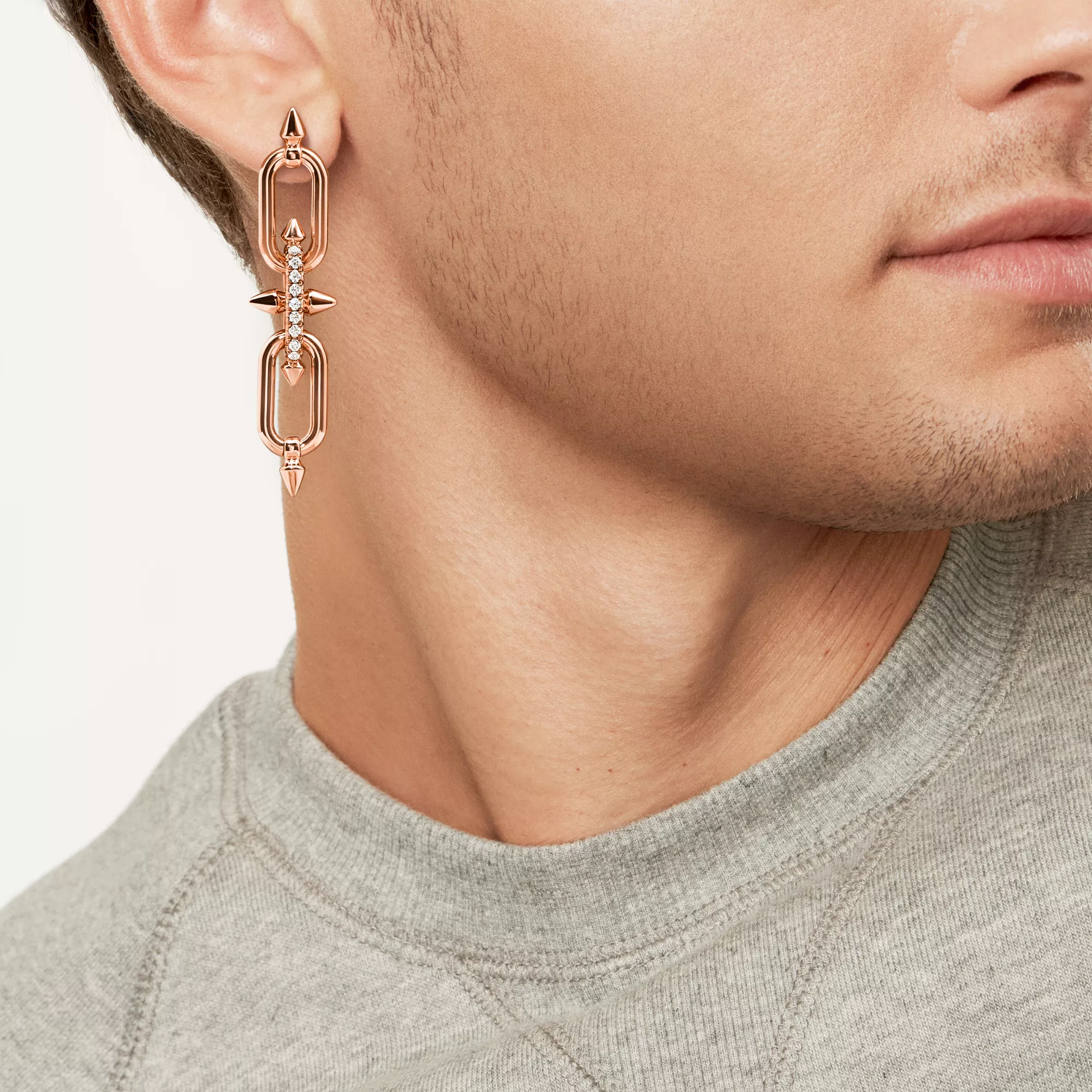 티파니의 유산을 이어 선구적인 아티스트와의 협업을 선보이는 티파니 타이탄 by 퍼렐 윌리엄스는 창의성을 불러일으키는 촉매로 저항 정신을 표현하였습니다. 포세이돈과 그의 삼지창에서 영감을 얻은 디자인을 선보입니다. 18K 로즈 골드로 제작된 각진 창 쉐입의 모티프와 부드러운 곡선의 링크가 강렬한 룩을 선사합니다. 피쉬테일 세팅 파베 다이아몬드를 통해 모든 각도에서 빛을 받아들여 최상의 광채를 선보입니다.
