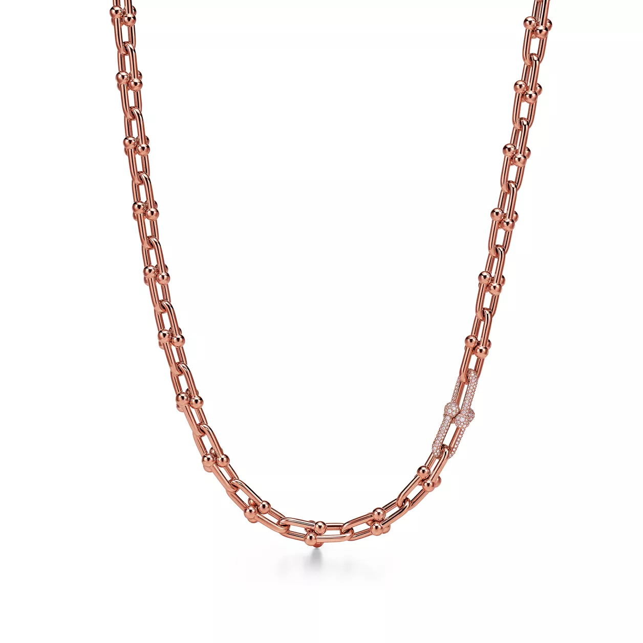 티파니 하드웨어는 사랑, 그 진정한 변화의 힘을 표현합니다. 티파니 1962년 아카이브에서 발견한 클래식한 브레이슬릿에서 영감을 얻은 하드웨어는 지속적인 회복력과 자유로운 정신을 구현합니다. 텐션과 비율, 색상이 어우러진 볼드한 디자인은 이번 컬렉션에 18K 로즈 골드로 제작한 시그니처 게이지 링크와 파베 다이아몬드가 특징인 링크가 특징입니다. 이 네크리스는 단독으로 착용하거나 다른 메탈 아이템과 믹스해 개성있는 색조의 대조를 연출할 수 있습니다.