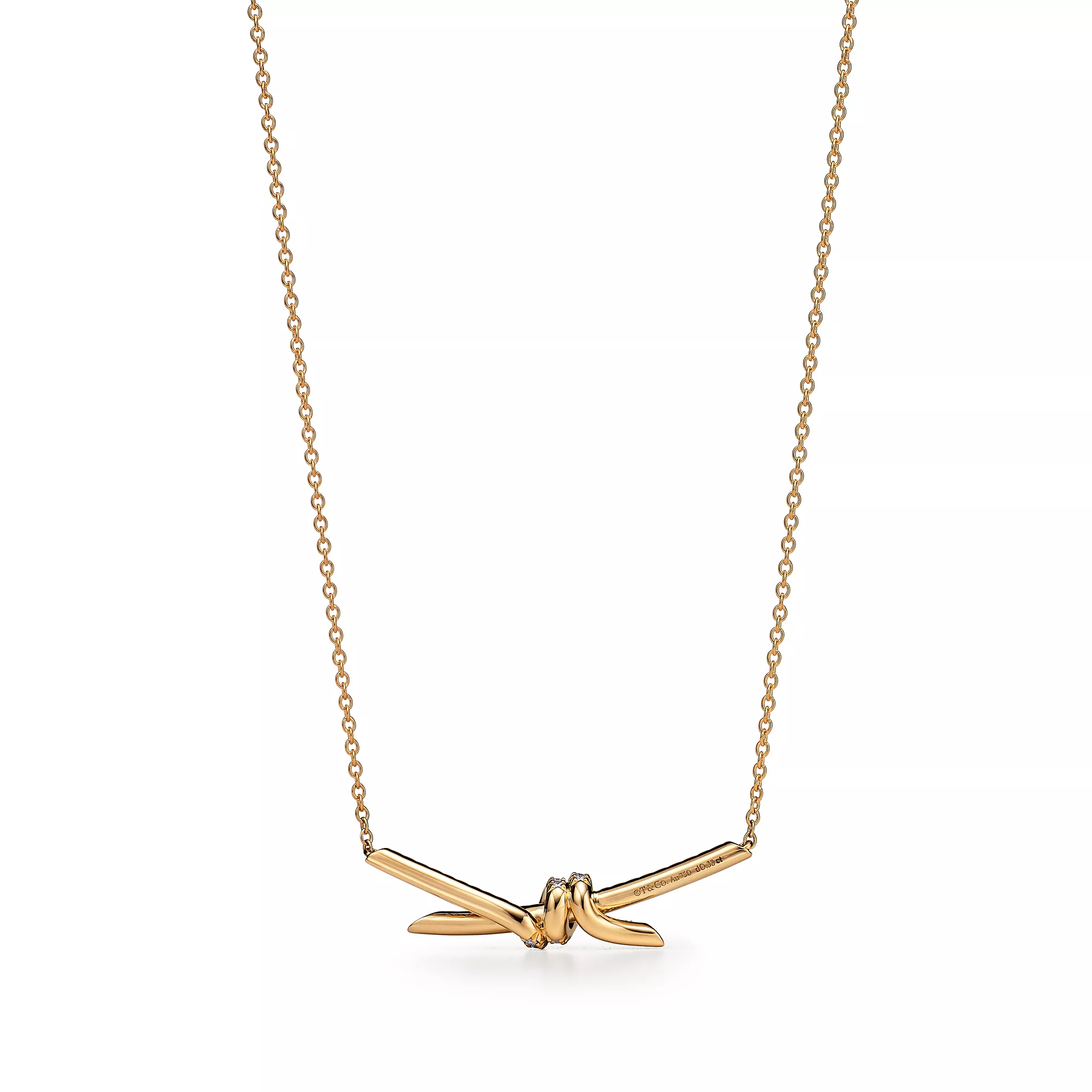 티파니 노트는 사랑의 변치 않는 결속을 표현합니다. 1889년에 제작된 아카이브 리본에서 영감을 받아 탄생한 노트는 인생에서 가장 오래 지속되는 유대감과 의미 있는 연결을 상징합니다. 옐로우 골드로 세공된 펜던트는 수작업으로 폴리싱하여 더욱 빛나는 광채를 선사합니다. 티파니의 엄격한 기준에 따라 선별된 각 라운드 브릴리언트 다이아몬드 또한 최고의 광채를 발할 수 있도록 수작업을 통해 정교하게 세팅되었습니다. 단독으로 착용하거나 다양한 길이의 펜던트와 함께 착용해 볼드한 룩을 연출해 보세요.