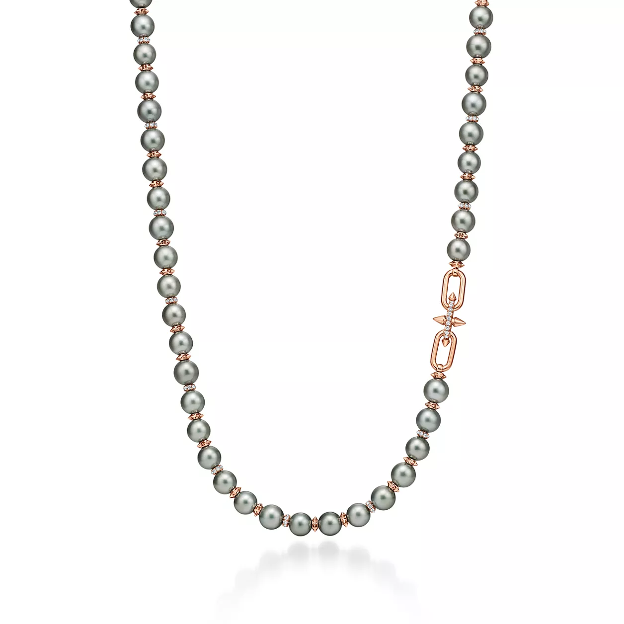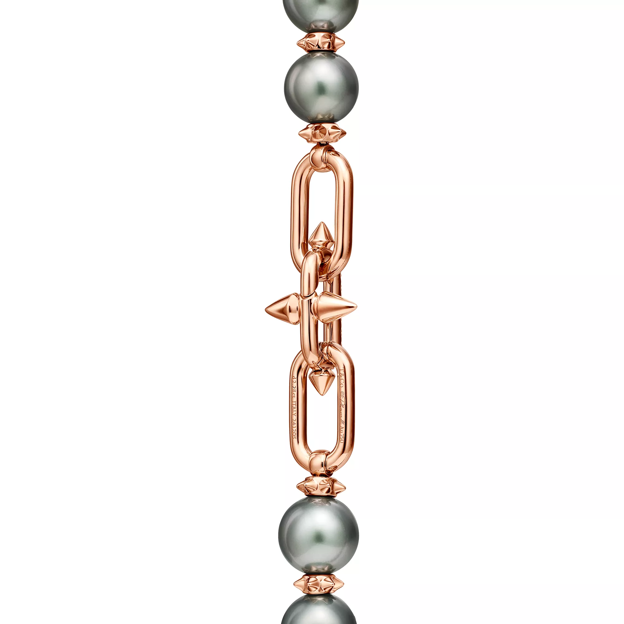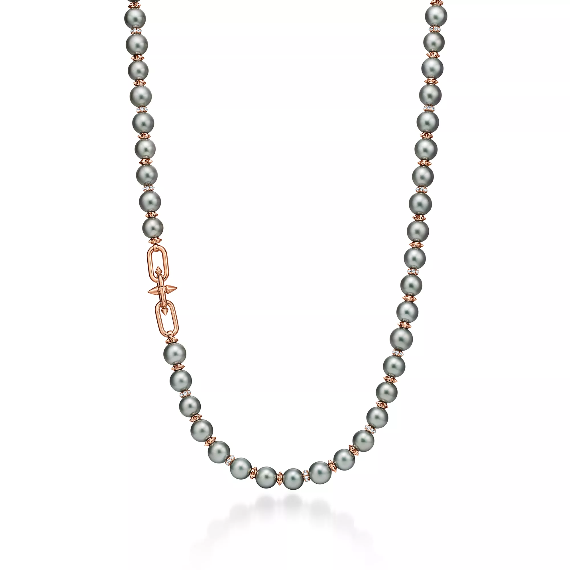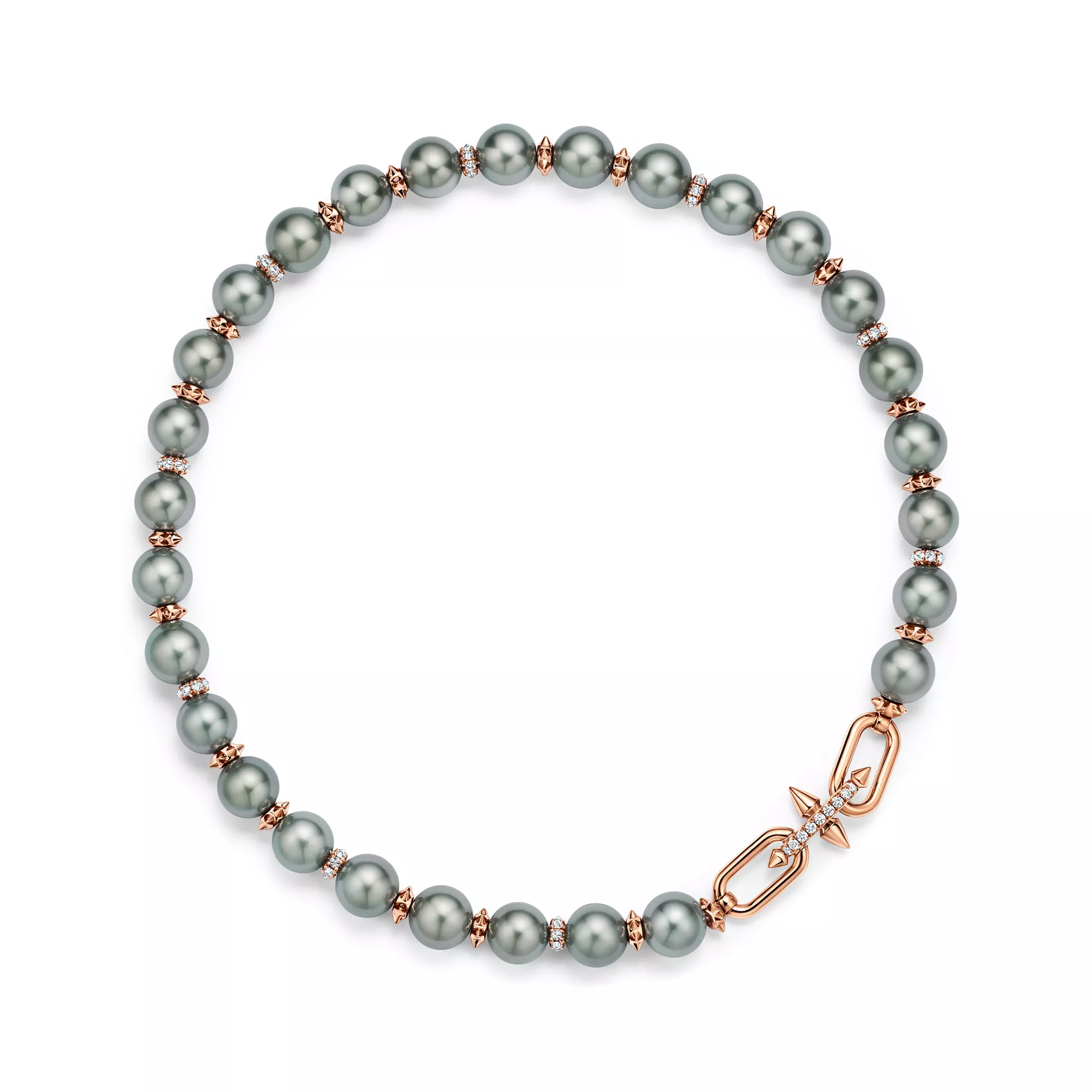 티파니의 유산을 이어 선구적인 아티스트와의 협업을 선보이는 티파니 타이탄 by 퍼렐 윌리엄스는 창의적인 저항 정신을 표현하였습니다. 티파니 타이탄 by 퍼렐 윌리엄스 타히티 진주 디자인은 18K 로즈 골드와 파베 다이아몬드로 둘러싸여 우아하게 빛나는 남양 블랙 진주가 특징입니다. 포세이돈과 그의 삼지창에서 영감을 얻은 스파이크 론델이 라지 사이즈 진주와 교대 배열된 디자인으로 광채 넘치는 다이아몬드 잠금장치과 함께 강렬한 룩을 선사합니다.