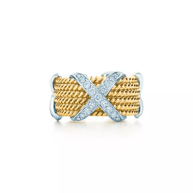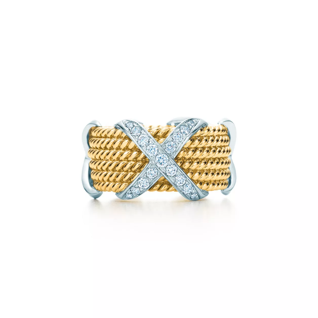 티파니 로프 식스 로우 X 링, 옐로우 골드, 플래티늄, 다이아몬드 세팅